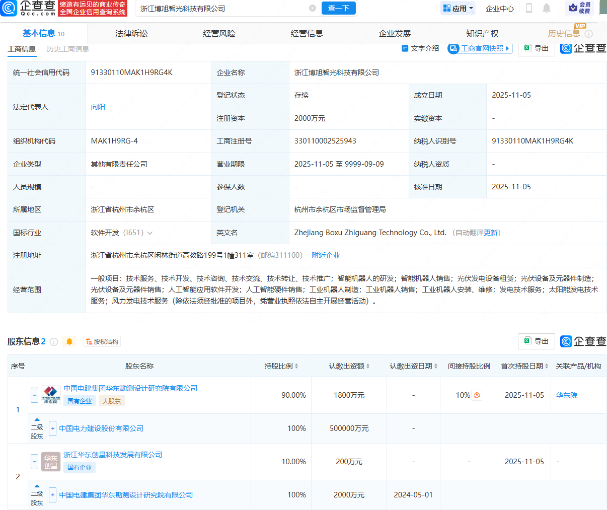企查查APP显示,近日,浙江博旭智光科技有限公司成立,法定代表人为向阳,注册资本为2000万元,经营范围包含:智能机器人的研发;智能机器人销售;光伏设备及元器件制造;人工智能应用软件开发等。企查查股权穿透显示,该公司由中国电建(601669)间接全资持股。
