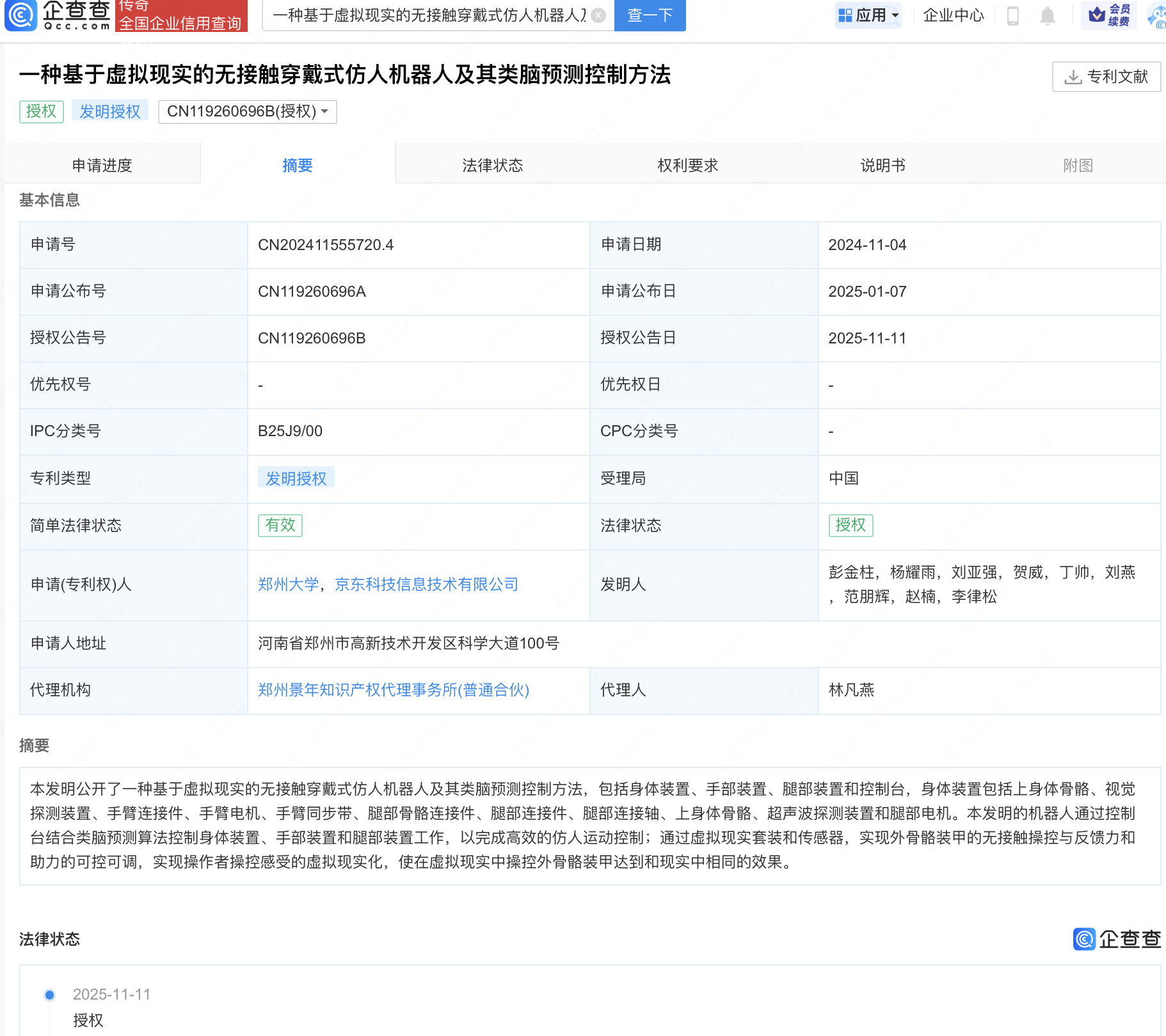 企查查APP显示,近日,郑州大学,京东科技信息技术有限公司“一种基于虚拟现实的无接触穿戴式仿人机器人及其类脑预测控制方法”专利获授权。企查查专利摘要显示,本发明包括身体装置、手部装置、腿部装置和控制台,身体装置包括上身体骨骼、视觉探测装置、手臂连接件、手臂电机、手臂同步带、腿部骨骼连接件、腿部连接件、腿部连接轴、上身体骨骼、超声波探测装置和腿部电机。