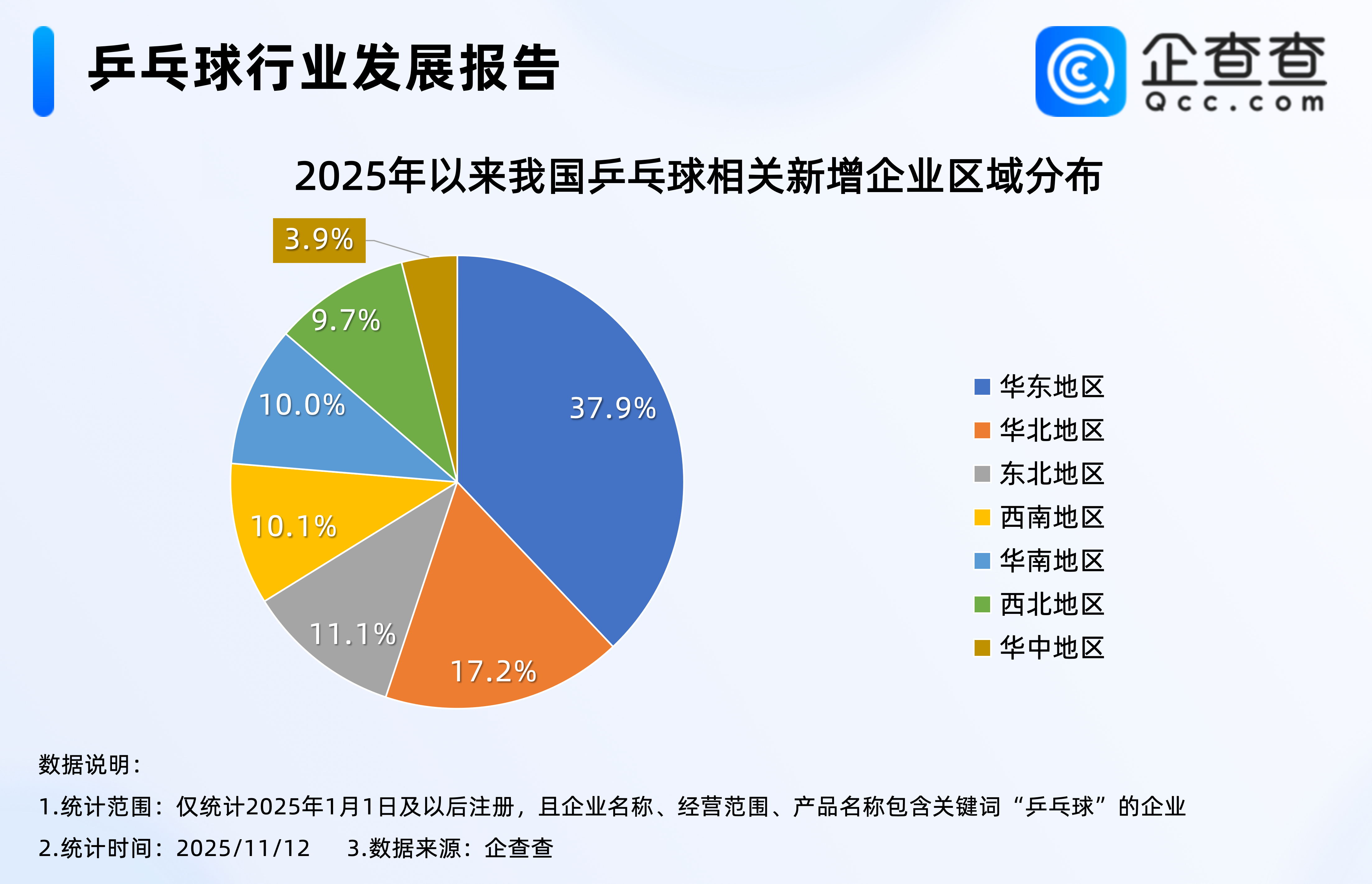 企查查数据显示,2025年以来,我国累计注册1165家乒乓球相关企业,相比2024年同期增加6.4%;今年新注册企业主要集中华东地区,占比37.9%;其次为华北地区,占比17.2%;华中地区今年新注册乒乓球相关企业相对较少,占比3.9%。