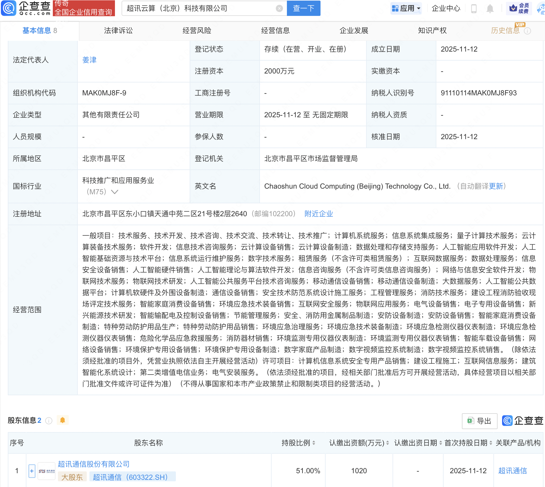 企查查APP显示,近日,超讯云算(北京)科技有限公司成立,注册资本2000万元,经营范围包含:人工智能硬件销售;人工智能理论与算法软件开发;物联网技术服务;物联网技术研发等。企查查股权穿透显示,该公司由超讯通信(603322)等共同持股。
