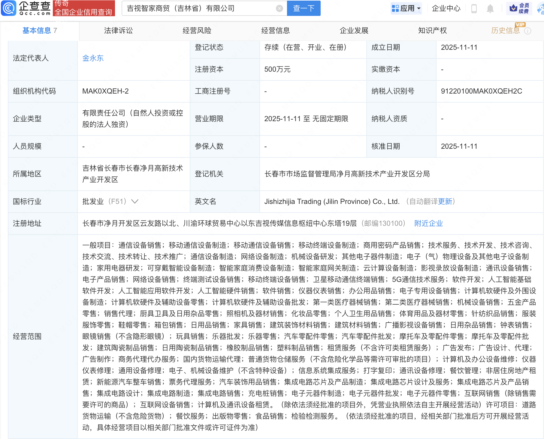 企查查APP显示,近日,吉视智家商贸(吉林省)有限公司成立,法定代表人为金永东,经营范围包含:人工智能基础软件开发;人工智能应用软件开发;集成电路芯片及产品制造;集成电路设计等。企查查股权穿透显示,该公司由吉视传媒(601929)全资持股。