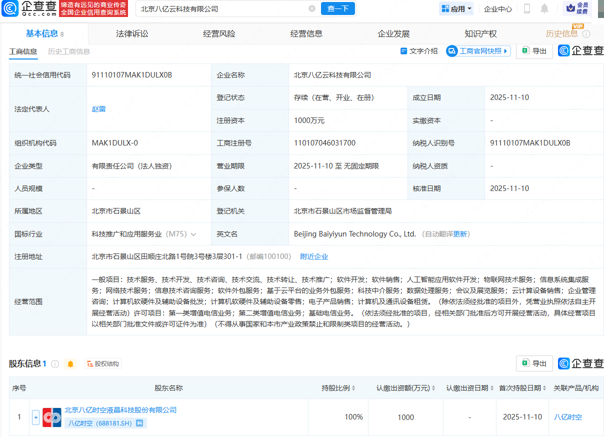 企查查APP显示,近日,北京八亿云科技有限公司成立,法定代表人为赵雷,注册资本为1000万元,经营范围包含:人工智能应用软件开发;物联网技术服务;数据处理服务;会议及展览服务;云计算设备销售等。企查查股权穿透显示,该公司由八亿时空(688181)全资持股。