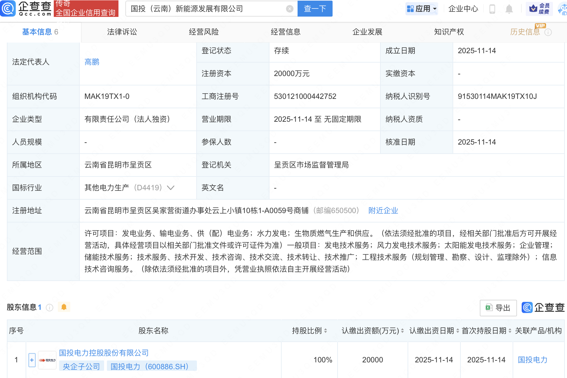 企查查APP显示,近日,国投(云南)新能源发展有限公司成立,注册资本2亿元,经营范围包含:发电技术服务;风力发电技术服务;太阳能发电技术服务;企业管理;储能技术服务等。企查查股权穿透显示,该公司由国投电力(600886)全资持股。