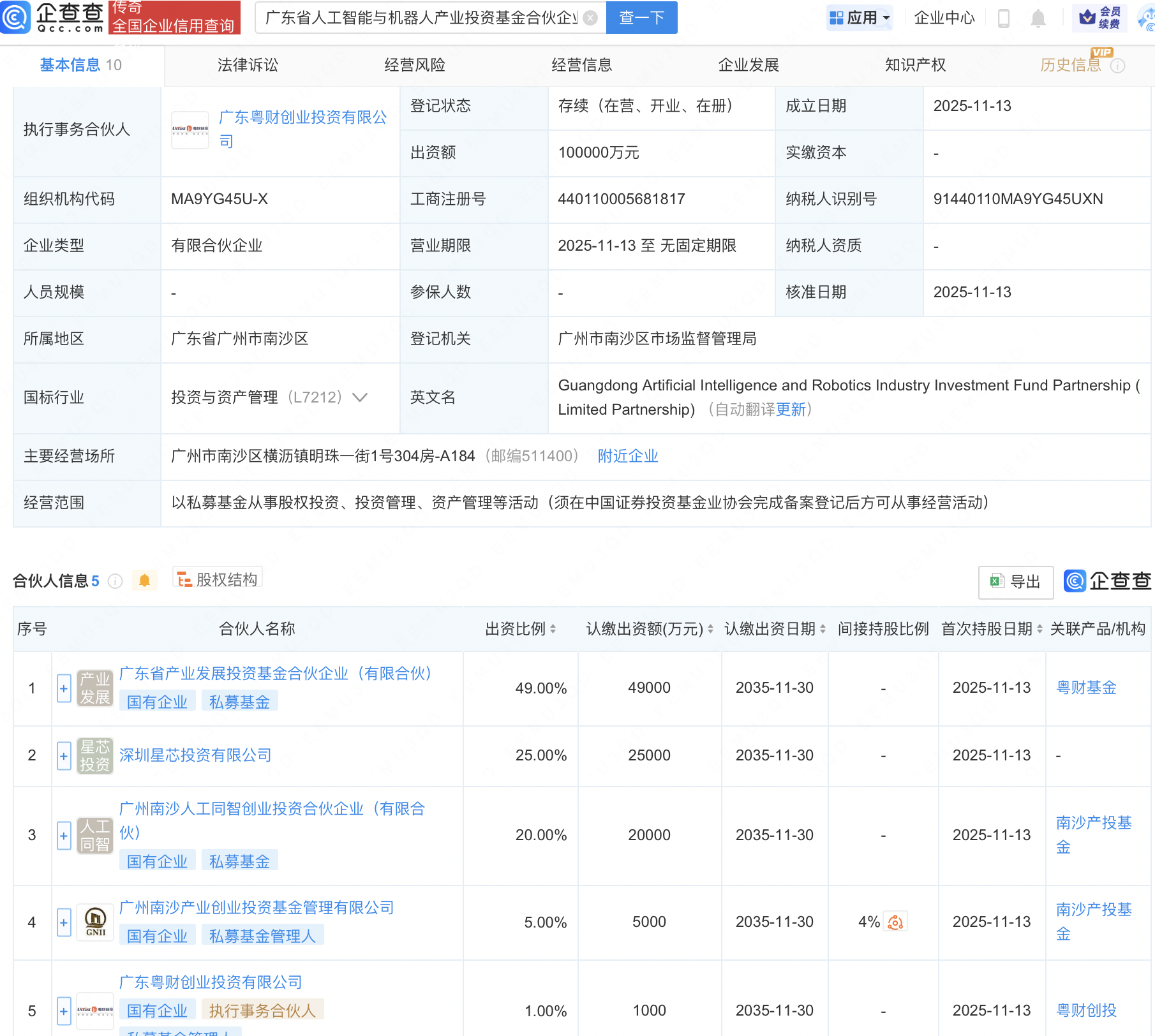 企查查APP显示,近日,广东省人工智能与机器人产业投资基金合伙企业(有限合伙)成立,出资额10亿元,经营范围包含:以私募基金从事股权投资、投资管理、资产管理等活动。企查查股权穿透显示,该企业由广东省产业发展投资基金合伙企业(有限合伙)等共同出资。