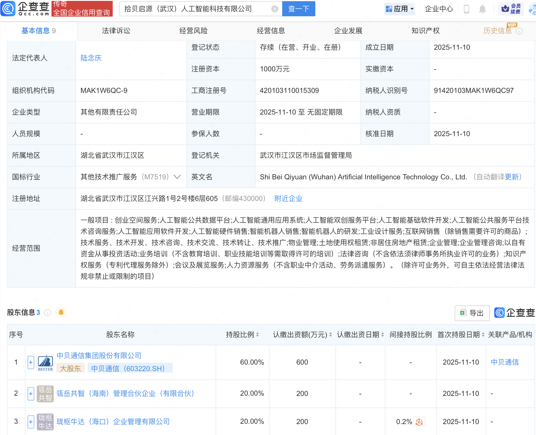 企查查APP显示,近日,拾贝启源(武汉)人工智能科技有限公司成立,注册资本1000万元,经营范围包含:人工智能公共服务平台技术咨询服务;人工智能应用软件开发;人工智能硬件销售;智能机器人销售;智能机器人的研发等。企查查股权穿透显示,该公司由中贝通信(603220)等共同持股。