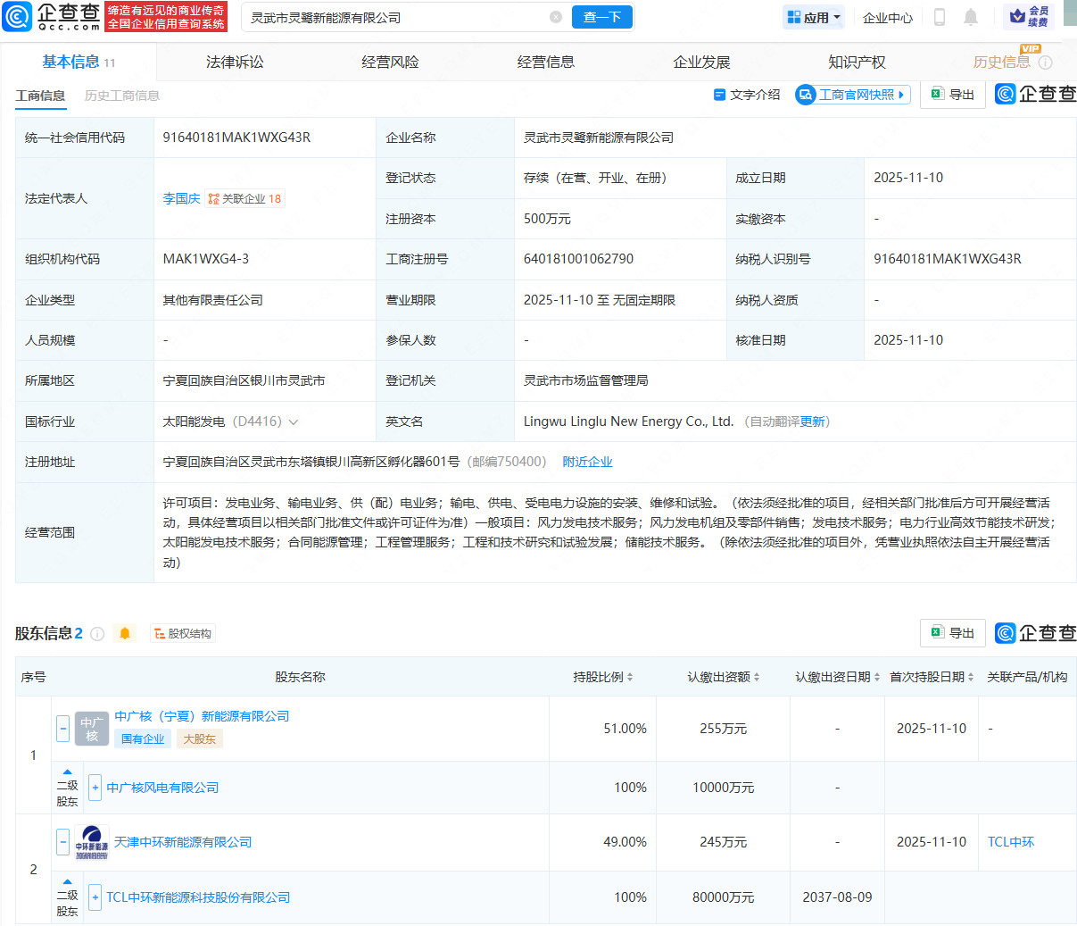 企查查APP显示,近日,灵武市灵鹭新能源有限公司成立,法定代表人为李国庆,经营范围包含:发电业务、输电业务、供(配)电业务;风力发电技术服务;发电技术服务等。企查查股权穿透显示,该公司由中广核风电有限公司全资子公司中广核(宁夏)新能源有限公司、TCL中环(002129)全资子公司天津中环新能源有限公司共同持股。