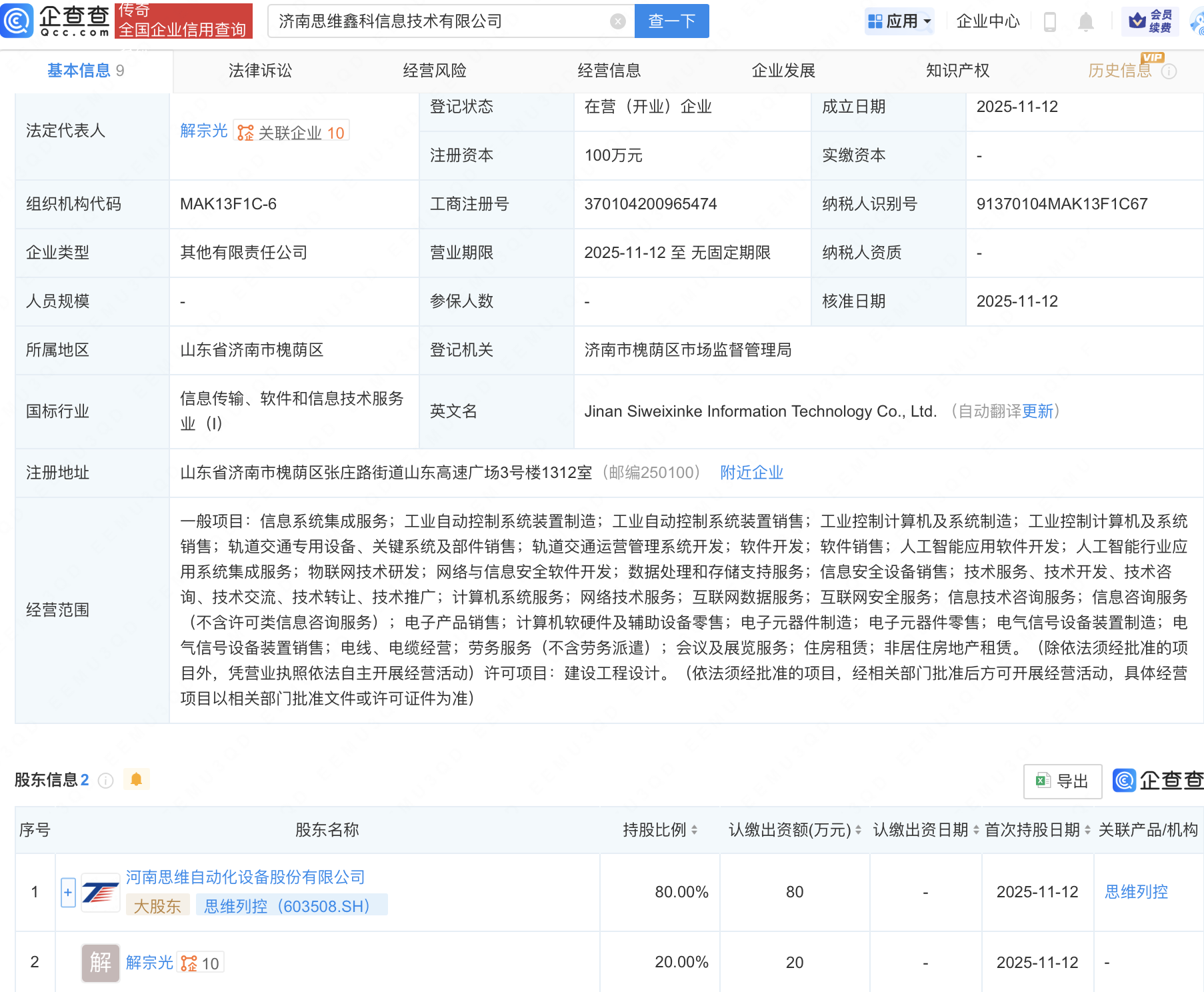 企查查APP显示,近日,济南思维鑫科信息技术有限公司成立,经营范围包含:人工智能应用软件开发;人工智能行业应用系统集成服务;物联网技术研发;网络与信息安全软件开发等。企查查股权穿透显示,该公司由思维列控(603508)等共同持股。