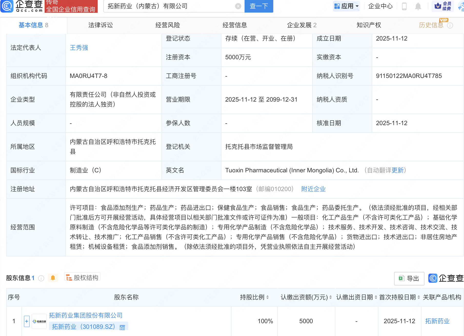 企查查APP显示,近日,拓新药业(内蒙古)有限公司成立,注册资本5000万元,经营范围包含:食品添加剂生产;药品生产;药品进出口;保健食品生产;食品销售等。企查查股权穿透显示,该公司由拓新药业(301089)全资持股。