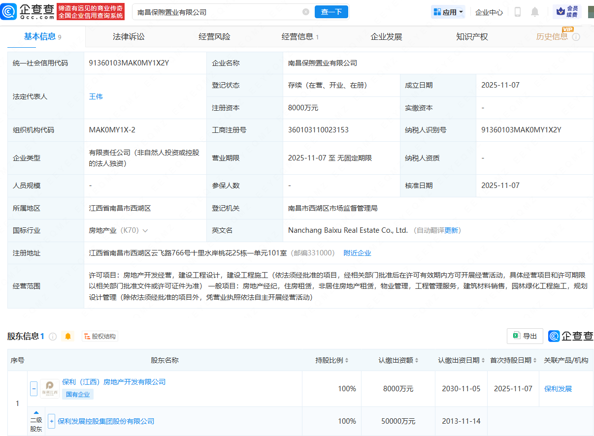 企查查APP显示,近日,南昌保煦置业有限公司成立,法定代表人为王伟,注册资本为8000万元,经营范围包含:房地产开发经营,建设工程设计,房地产经纪,住房租赁,非居住房地产租赁,物业管理等。企查查股权穿透显示,该公司由保利发展(600048)间接全资持股。