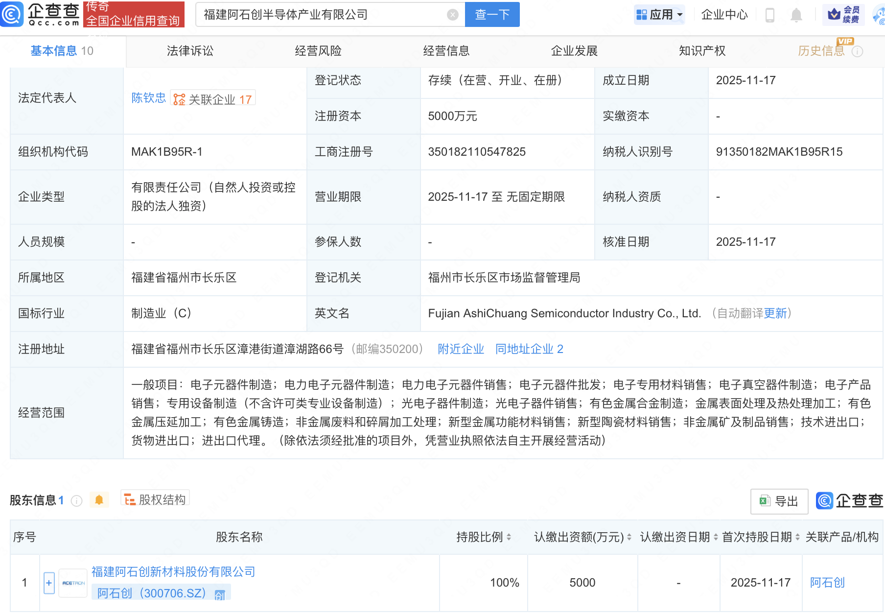 企查查APP显示,近日,福建阿石创半导体产业有限公司成立,注册资本5000万元,经营范围包含:电子元器件制造;电力电子元器件制造;电力电子元器件销售;电子元器件批发等。企查查股权穿透显示,该公司由阿石创(300706)全资持股。