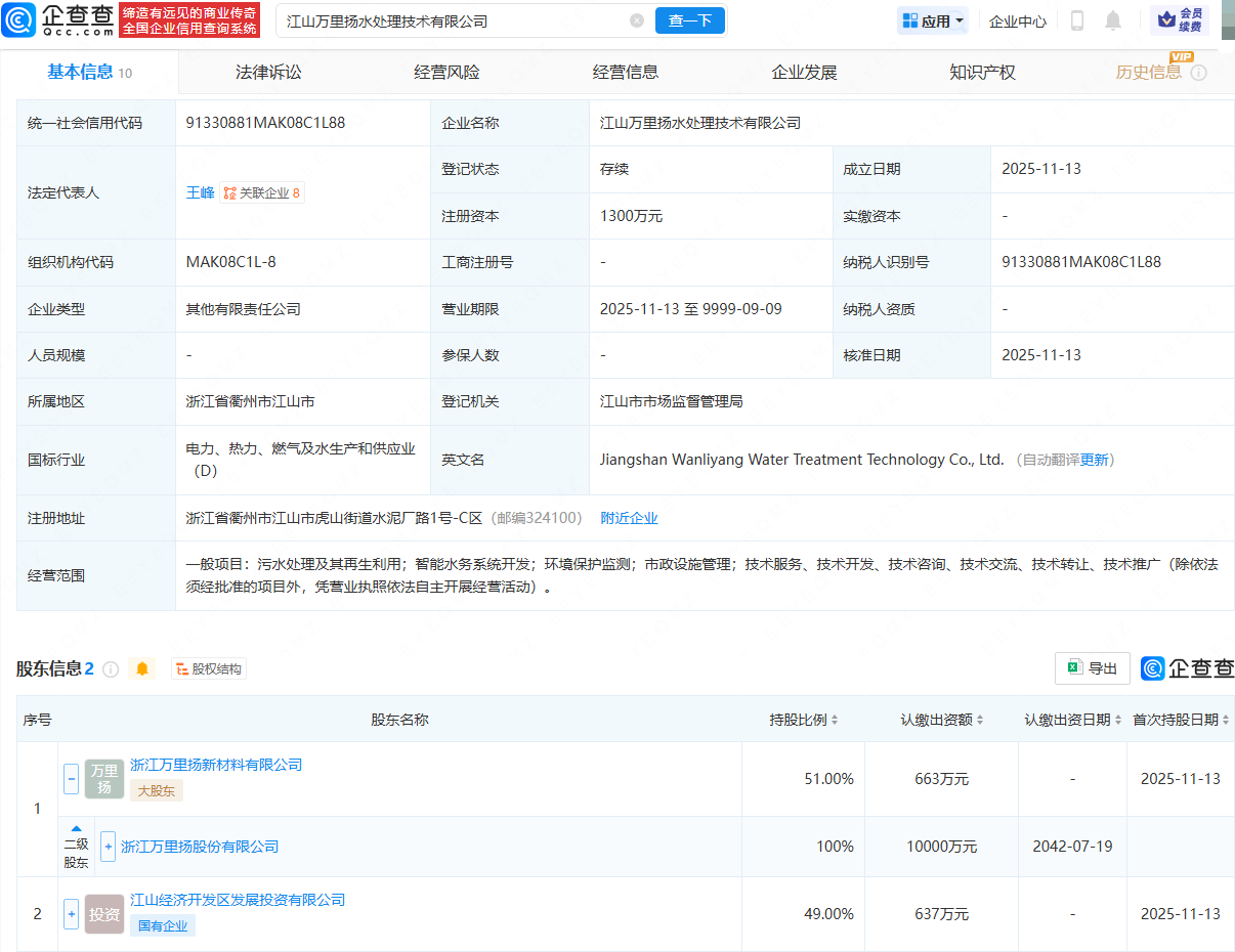 企查查APP显示,近日,江山万里扬水处理技术有限公司成立,法定代表人为王峰,注册资本为1300万元,经营范围包含:污水处理及其再生利用;智能水务系统开发;环境保护监测;市政设施管理等。企查查股权穿透显示,该公司由万里扬(002434)全资子公司浙江万里扬新材料有限公司、江山经济开发区发展投资有限公司共同持股。