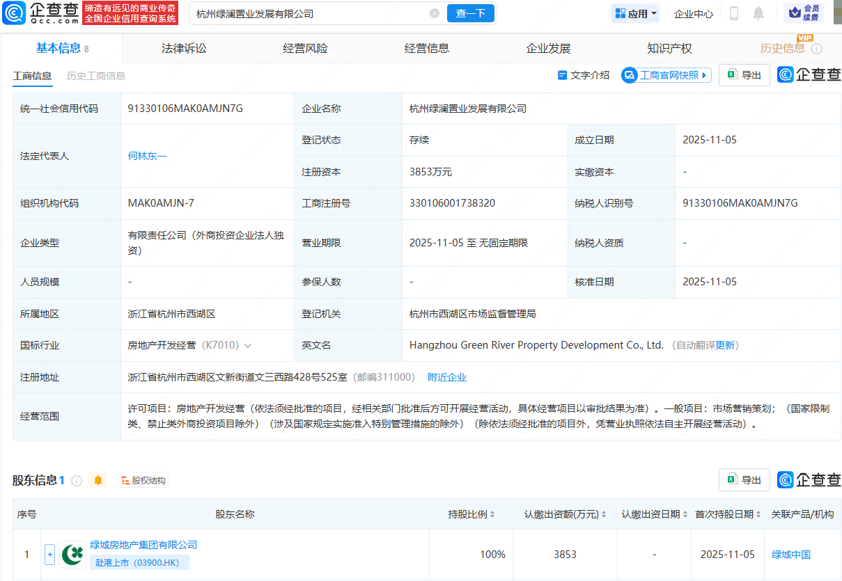 企查查APP显示,近日,杭州绿澜置业发展有限公司成立,法定代表人为何林东一,注册资本为3853万元,经营范围包含:房地产开发经营;市场营销策划。企查查股权穿透显示,该公司由绿城房地产集团有限公司全资持股。