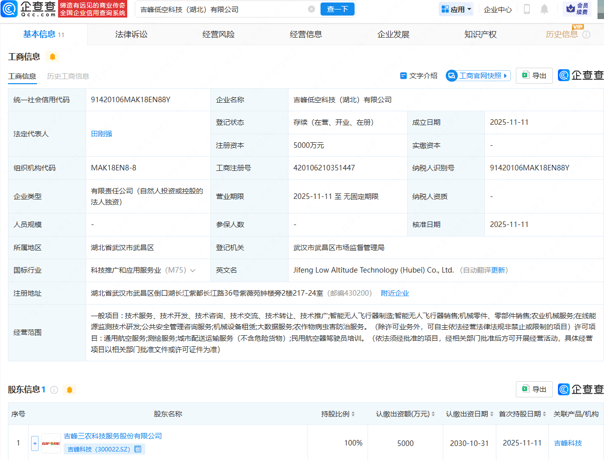 企查查APP显示,近日,吉峰低空科技(湖北)有限公司成立,法定代表人为田刚强,注册资本为5000万元,经营范围包含:智能无人飞行器制造;智能无人飞行器销售;通用航空服务;测绘服务;民用航空器驾驶员培训等。企查查股权穿透显示,该公司由吉峰科技(300022)全资持股。