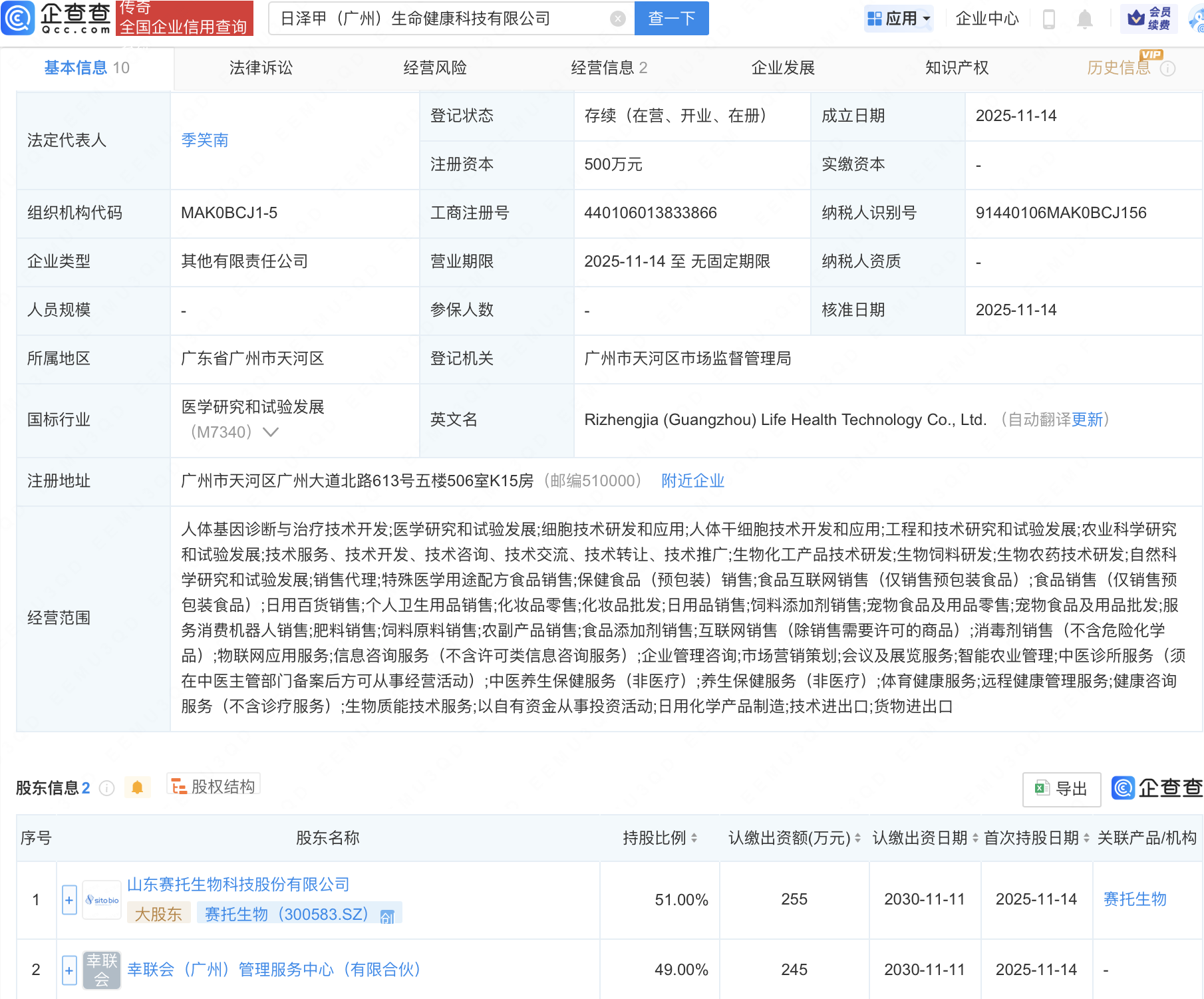 企查查APP显示,近日,日泽甲(广州)生命健康科技有限公司成立,经营范围包含:人体基因诊断与治疗技术开发;医学研究和试验发展;细胞技术研发和应用;物联网应用服务等。企查查股权穿透显示,该公司由赛托生物(300583)等共同持股。