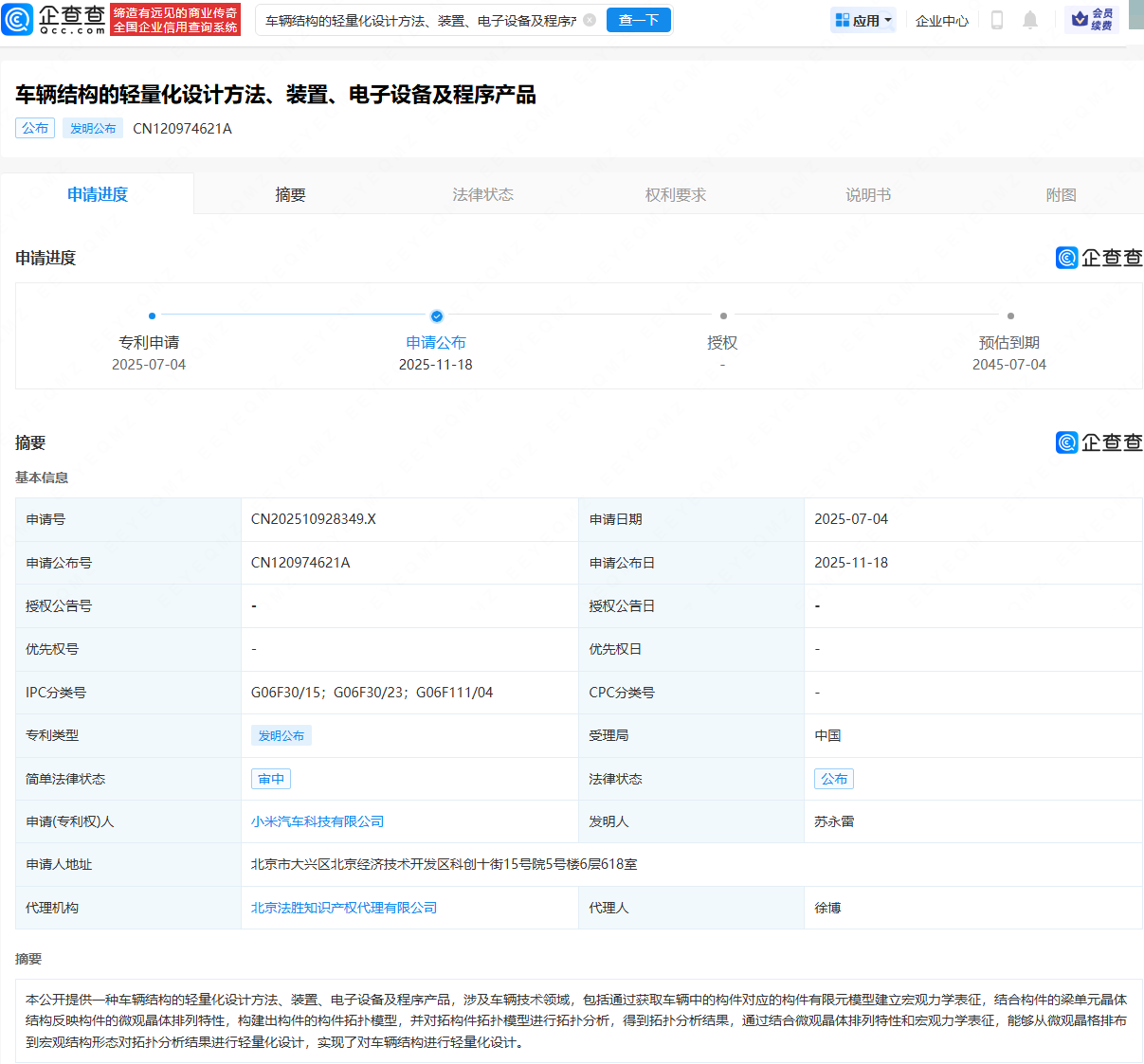 企查查APP显示,近日,小米汽车科技有限公司申请的“车辆结构的轻量化设计方法、装置、电子设备及程序产品”专利公布。