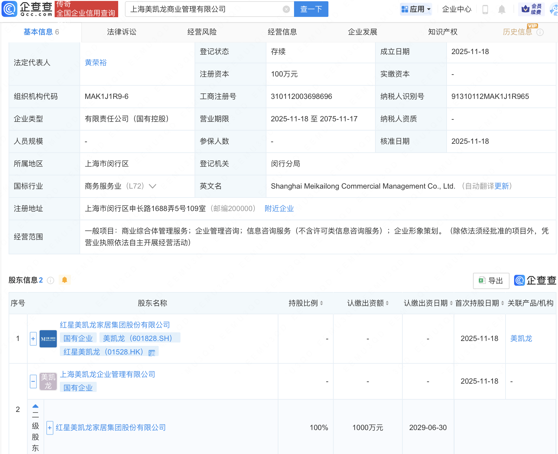 企查查APP显示,近日,上海美凯龙商业管理有限公司成立,经营范围包含:商业综合体管理服务;企业管理咨询;信息咨询服务(不含许可类信息咨询服务);企业形象策划。企查查股权穿透显示,该公司由美凯龙(601828)间接全资持股。