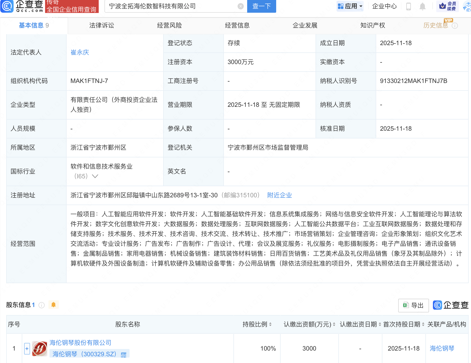 企查查APP显示,近日,宁波全拓海伦数智科技有限公司成立,注册资本3000万元,经营范围包含:人工智能应用软件开发;人工智能基础软件开发;人工智能理论与算法软件开发等。企查查股权穿透显示,该公司由海伦钢琴(300329)全资持股。