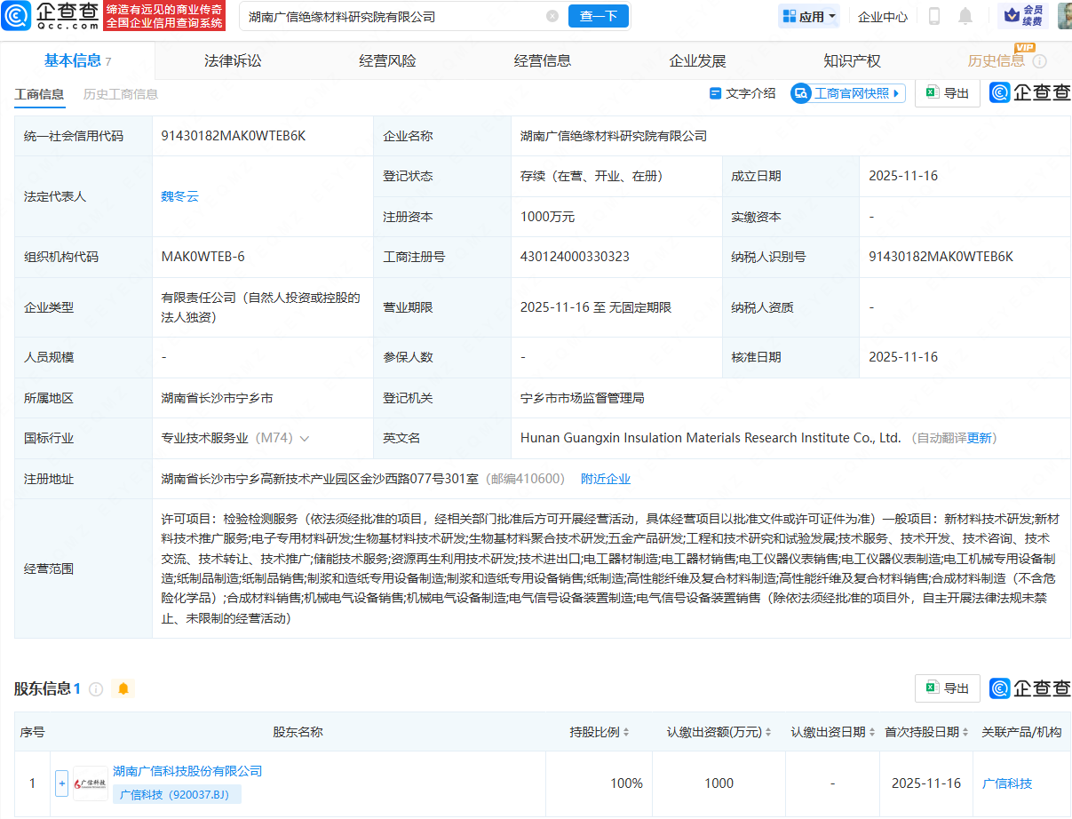 企查查APP显示,近日,湖南广信绝缘材料研究院有限公司成立,法定代表人为魏冬云,注册资本为1000万元,经营范围包含:新材料技术推广服务;电子专用材料研发;生物基材料技术研发;生物基材料聚合技术研发等。企查查股权穿透显示,该公司由广信科技(920037)全资持股。