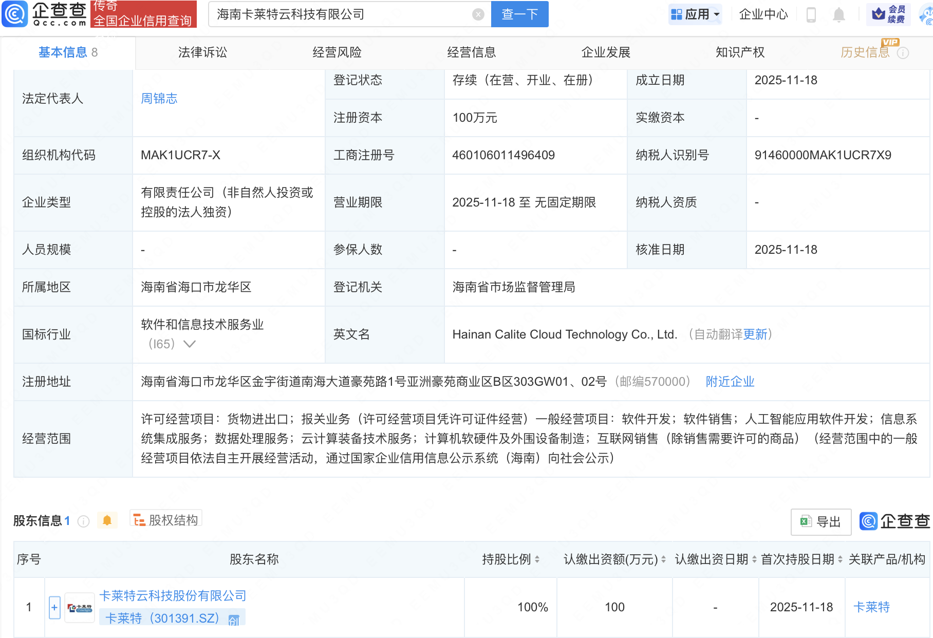企查查APP显示,近日,海南卡莱特云科技有限公司成立,经营范围包含:人工智能应用软件开发;信息系统集成服务;数据处理服务;云计算装备技术服务等。企查查股权穿透显示,该公司由卡莱特(301391)全资持股。