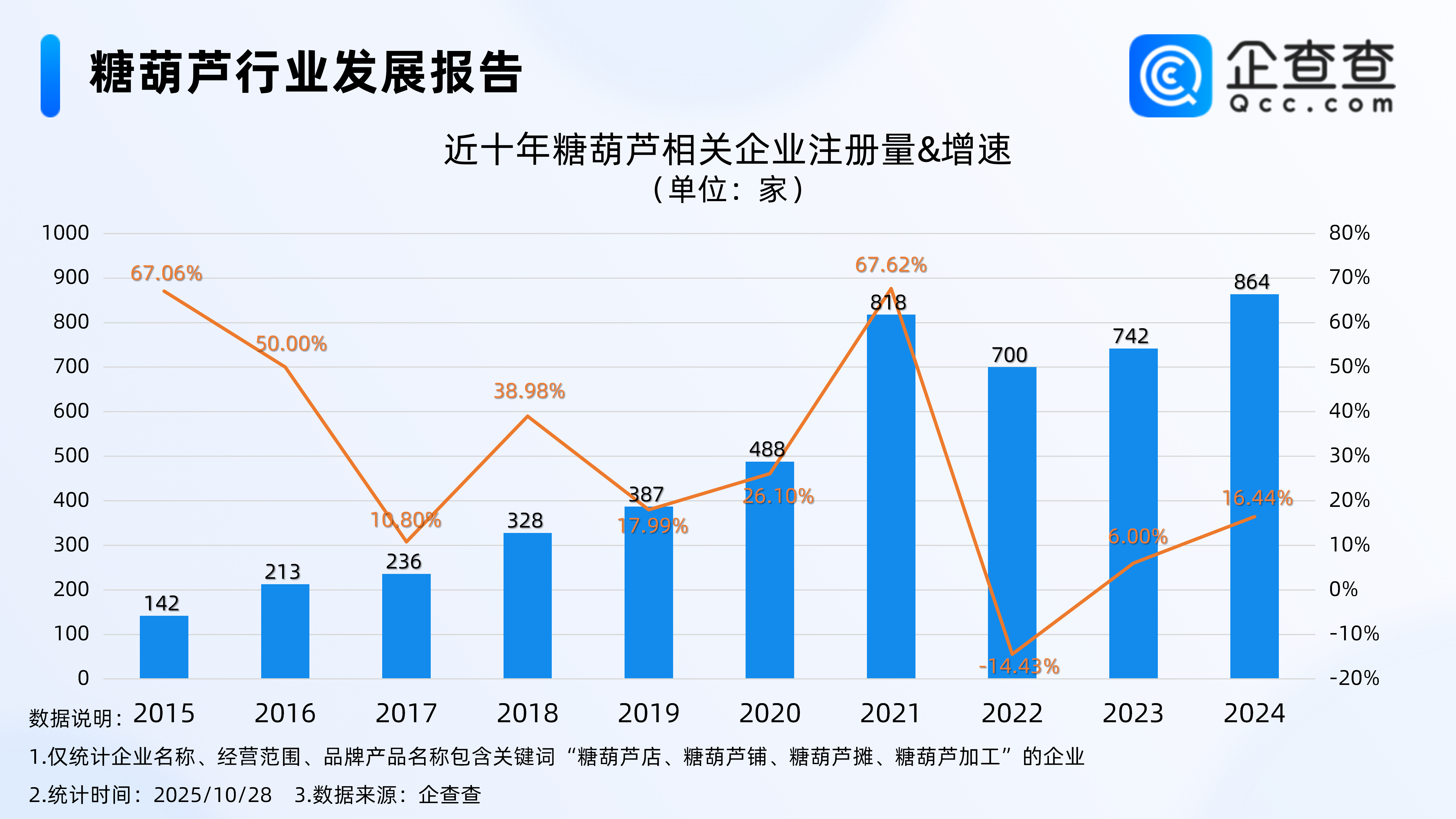 企查查数据显示,截至10月29日,国内现存糖葫芦相关企业3437家。近十年相关企业注册量呈整体增长态势,2021年全年注册818家相关企业,同比增长67.62%,达近十年注册增速峰值。2024年全年注册量同比增长16.44%至864家,创近十年注册量新高。截至目前,今年已注册608家。