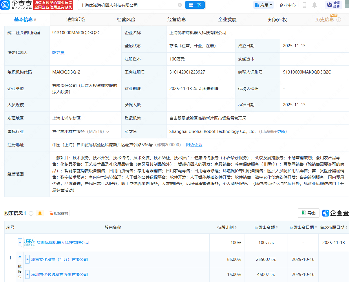企查查APP显示,近日,上海优诺海机器人科技有限公司成立,法定代表人为胡亦晨,经营范围包含:健康咨询服务(不含诊疗服务);市场营销策划;智能机器人的研发;家具销售;人工智能基础软件开发等。企查查股权穿透显示,该公司由深圳优海机器人科技有限公司全资持股,后者由澜古文化科技(江苏)有限公司、优必选(09880.HK)共同持股。