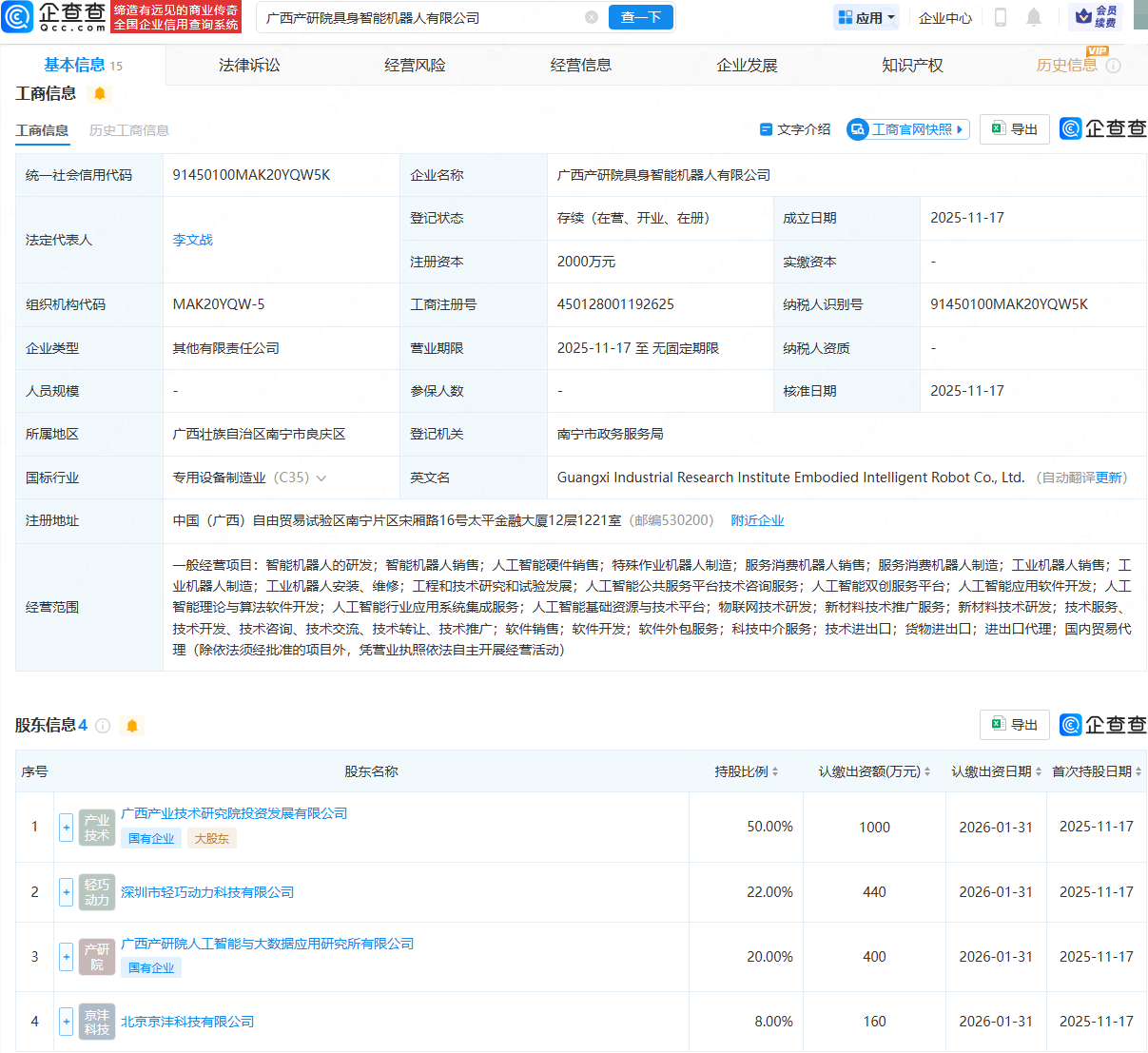 企查查APP显示,近日,广西产研院具身智能机器人有限公司成立,法定代表人为李文战,经营范围包含:智能机器人的研发;人工智能硬件销售;特殊作业机器人制造;服务消费机器人销售等。企查查股权穿透显示,该公司由广西产业技术研究院投资发展有限公司、广西产研院人工智能与大数据应用研究所有限公司等共同持股。