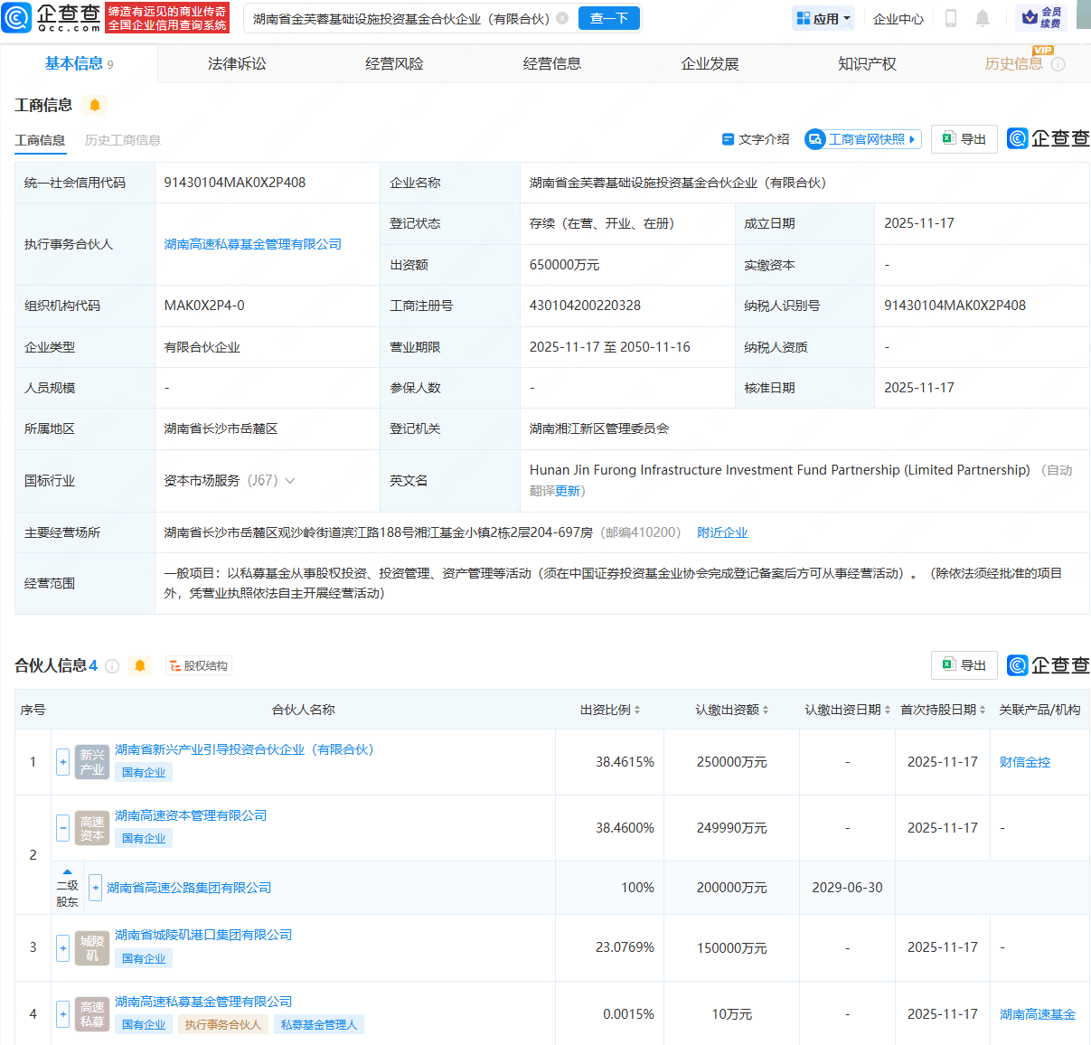 企查查APP显示,近日,湖南省金芙蓉基础设施投资基金合伙企业(有限合伙)成立,出资额65亿元,经营范围包括以私募基金从事股权投资、投资管理、资产管理等活动。企查查股权穿透显示,该合伙企业由湖南省新兴产业引导投资合伙企业(有限合伙)、湖南省高速公路集团有限公司旗下湖南高速私募基金管理有限公司等共同出资。