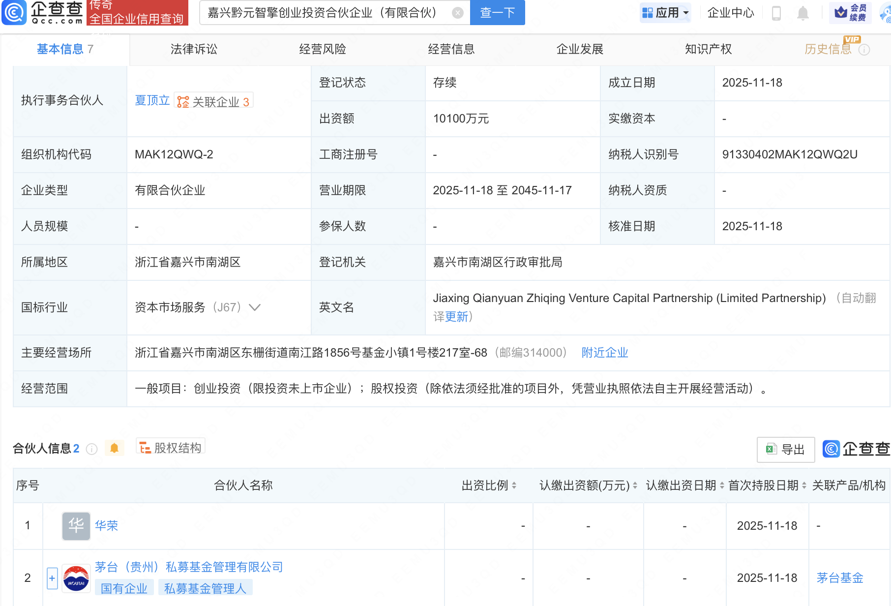 企查查APP显示,近日,嘉兴黔元智擎创业投资合伙企业(有限合伙)成立,出资额约1亿元,经营范围包含:创业投资(限投资未上市企业);股权投资。企查查股权穿透显示,该企业由茅台(贵州)私募基金管理有限公司等共同出资。