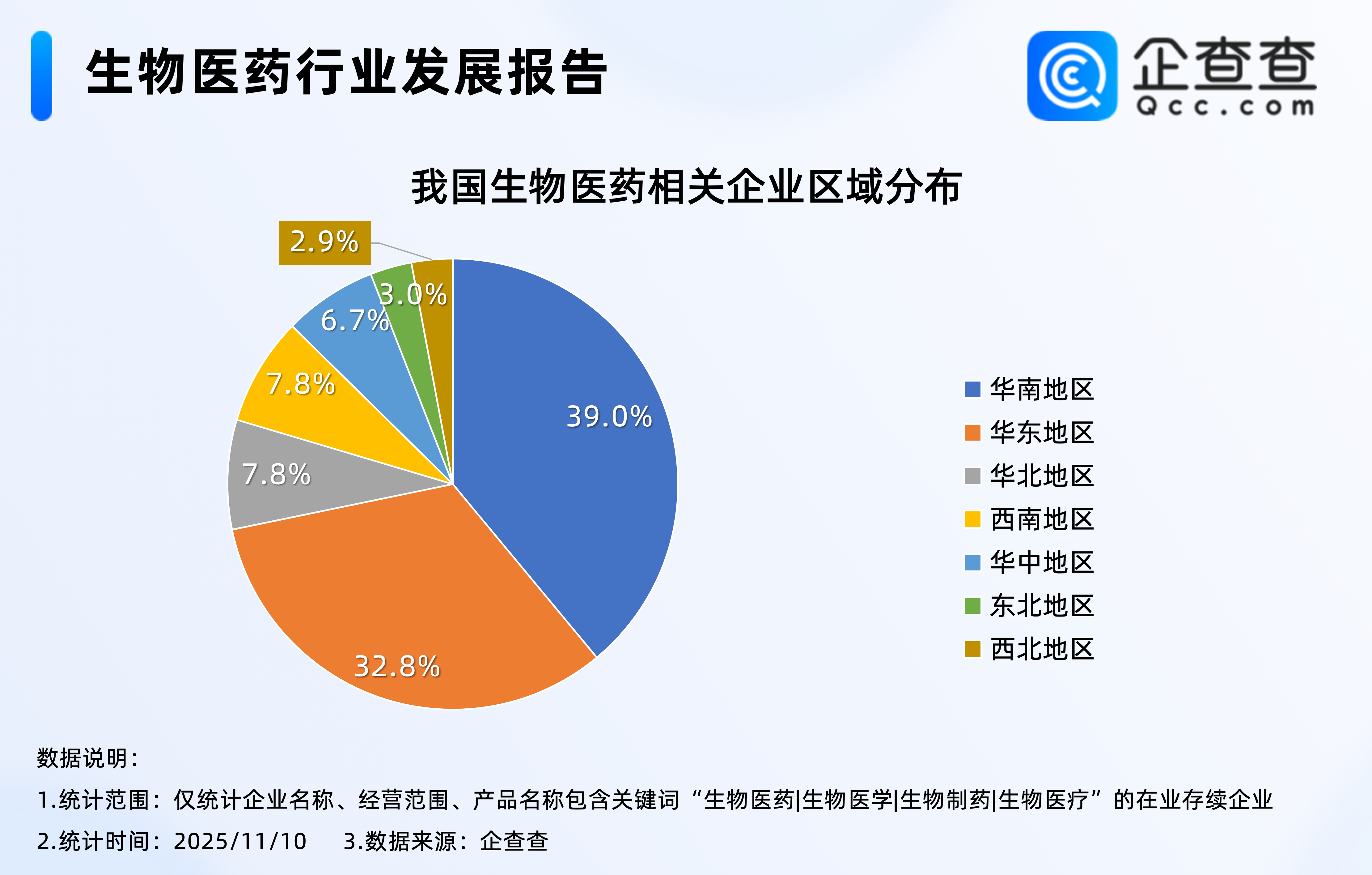 企查查数据显示,截至11月10日,我国现存4.57万家生物医药相关企业。区域分布上,华南地区最多,占比39.0%,其次是华东地区,占比32.8%,东北、西北地区相对较少,分占3.0%、2.9%。
