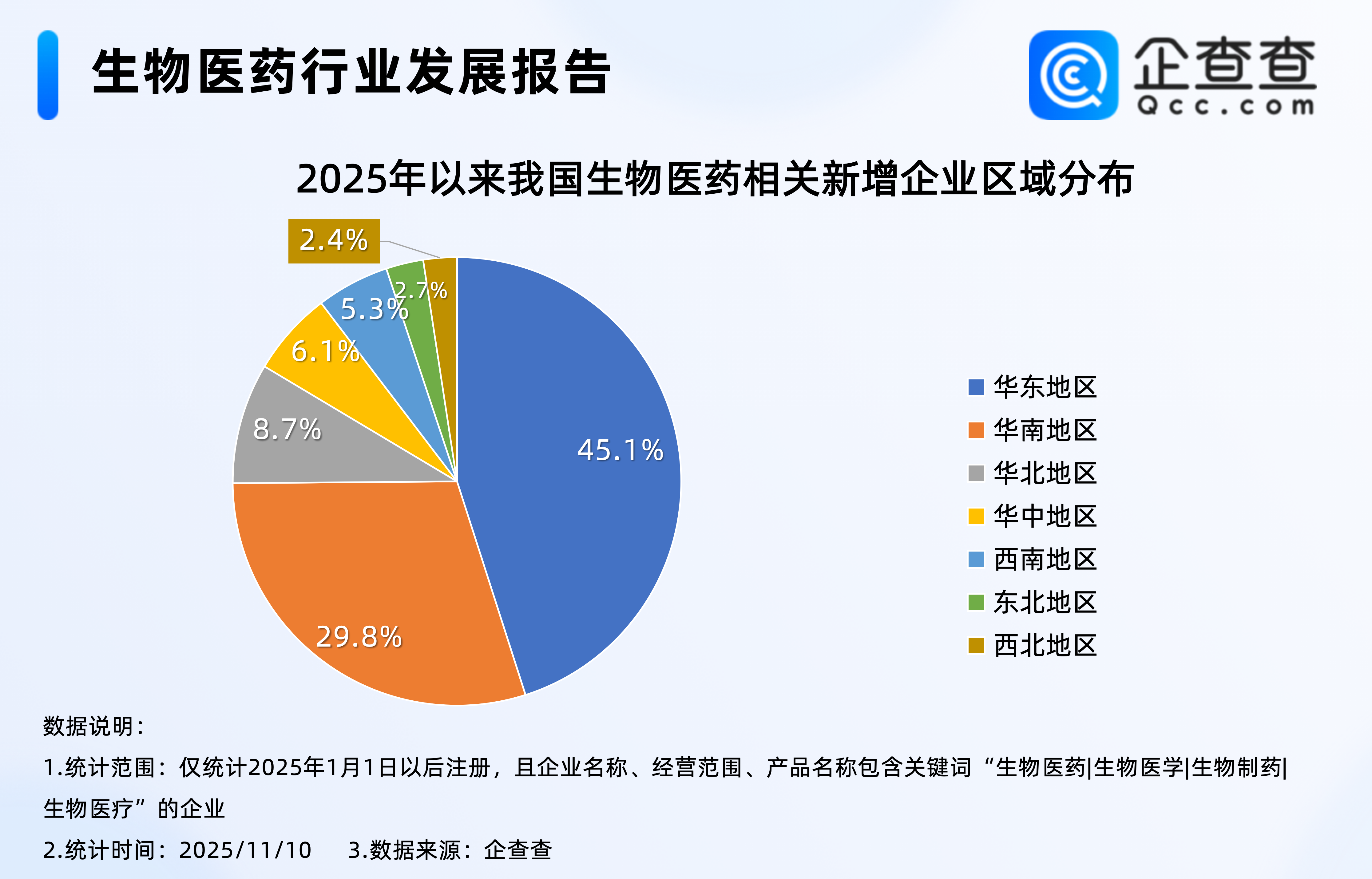 企查查数据显示,截至11月10日,2025年我国新注册3311家生物医药相关企业,区域分布上集中华东地区,占比45.1%,其次是华南地区,占比29.8%,东北、西北地区相对较少,分占2.7%、2.4%。