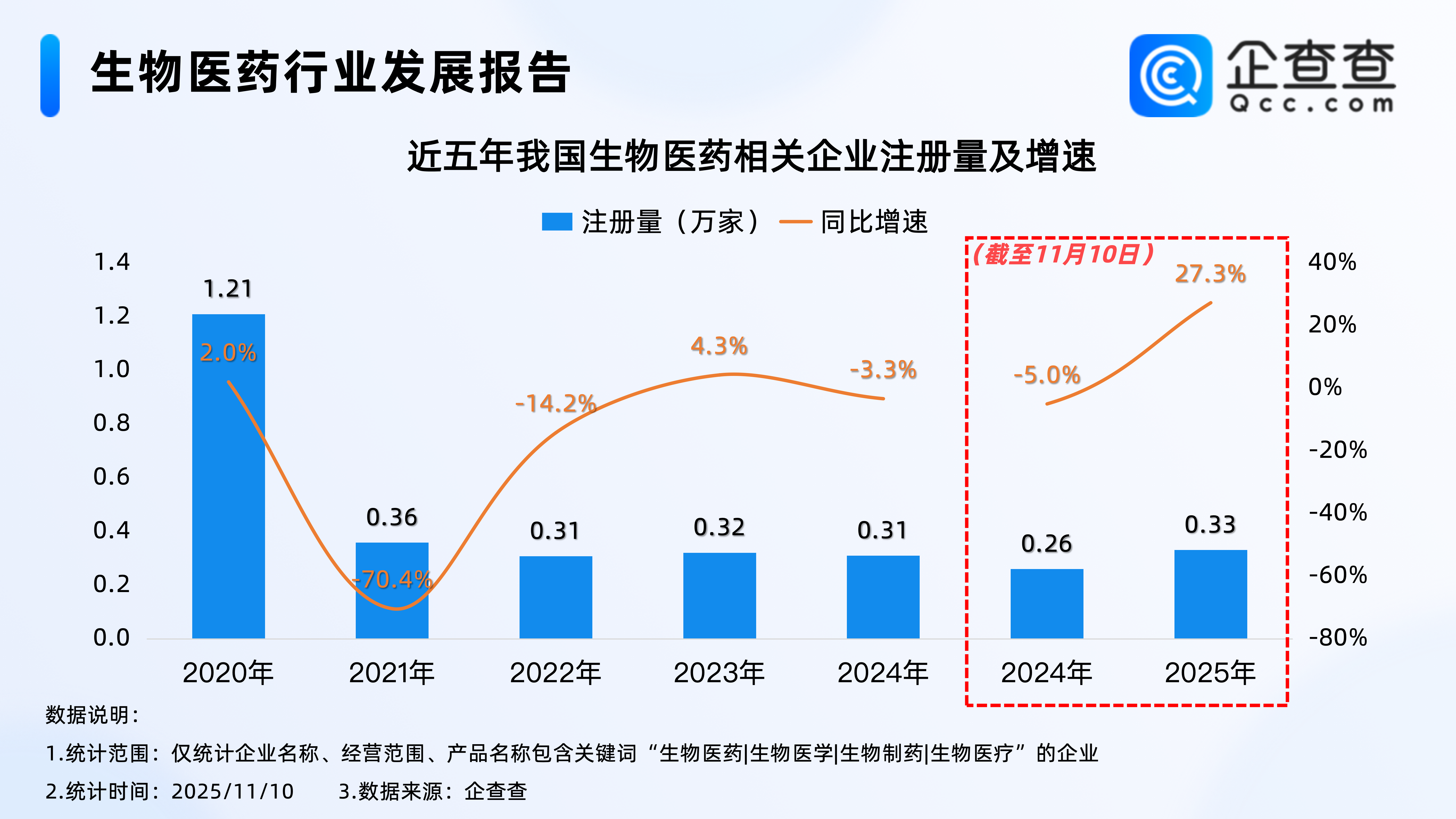 企查查数据显示,2021年至2024年之间,我国生物医药相关企业每年注册量保持在3000家至3600家之间;截至11月10日,2025年我国已注册3311家生物医药相关企业,已超2024年全年,相比2024年同期增加27.3%。