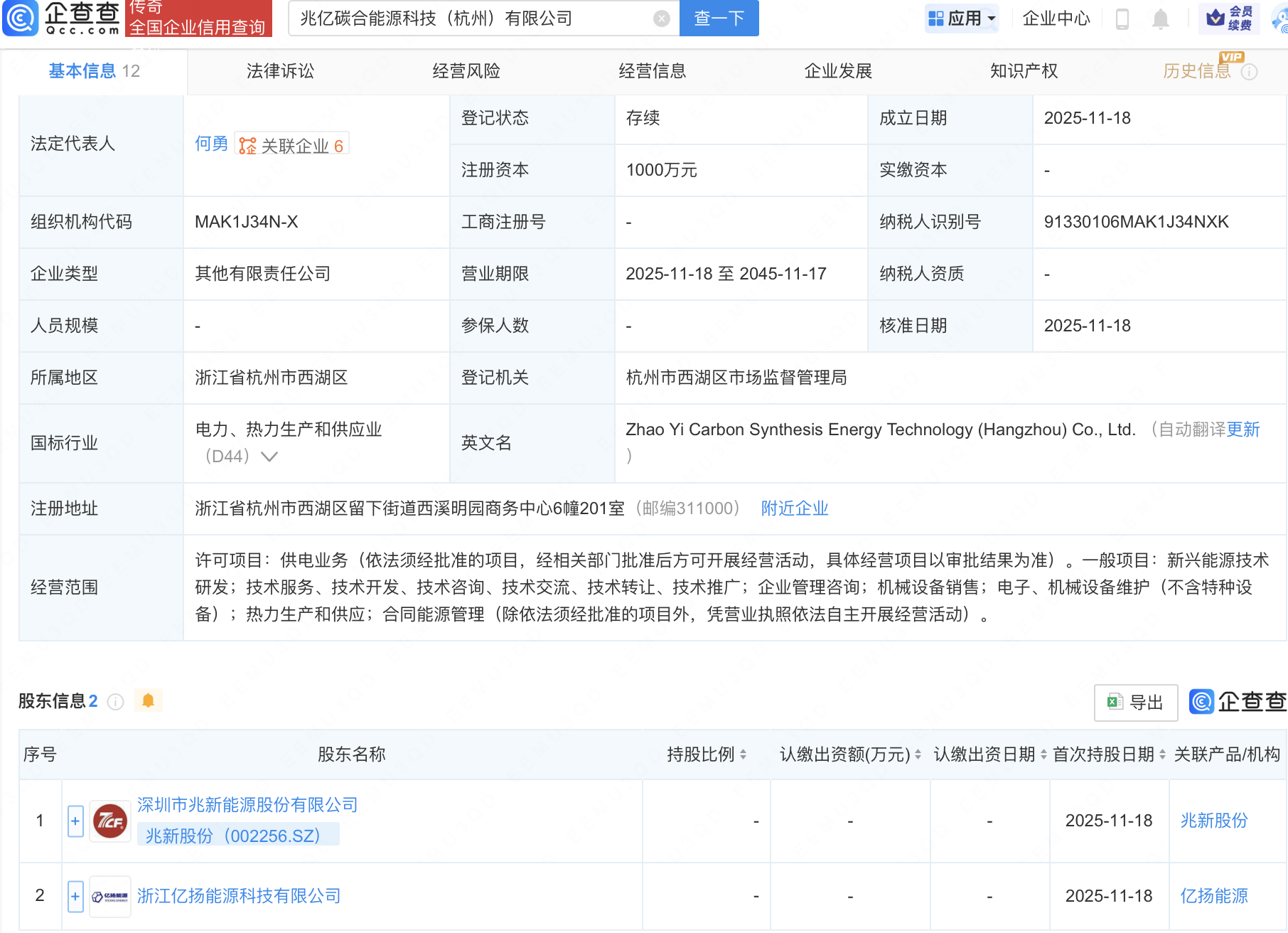 企查查APP显示,近日,兆亿碳合能源科技(杭州)有限公司成立,注册资本1000万元,经营范围包含:企业管理咨询;机械设备销售;电子、机械设备维护(不含特种设备)等。企查查股权穿透显示,该公司由兆新股份(002256)等共同持股。