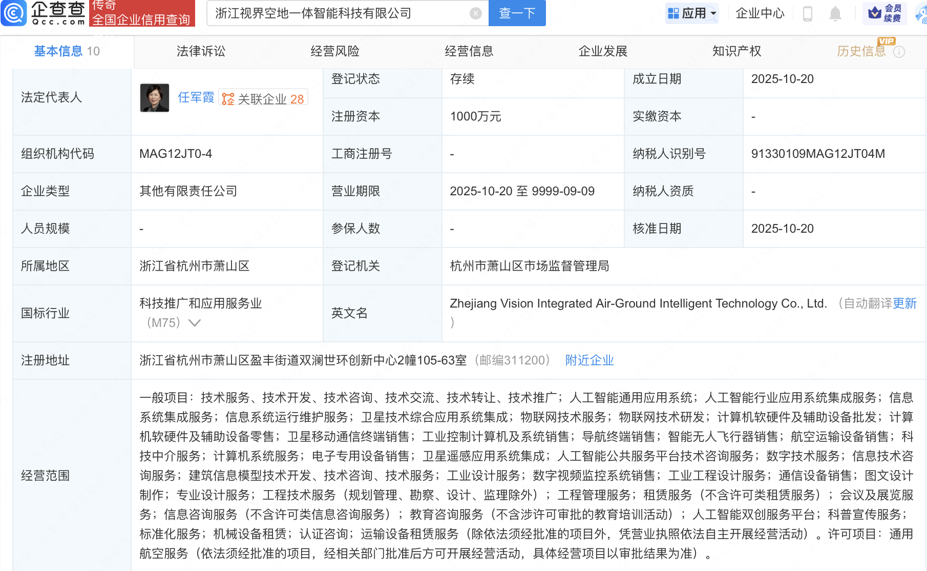 企查查APP显示,近日,浙江视界空地一体智能科技有限公司成立,注册资本1000万元,经营范围包含:人工智能通用应用系统;人工智能行业应用系统集成服务;物联网技术研发;智能无人飞行器销售等。企查查股权穿透显示,该公司由道通科技(688208)全资子公司深圳市道和通泰机器人有限公司等共同持股。