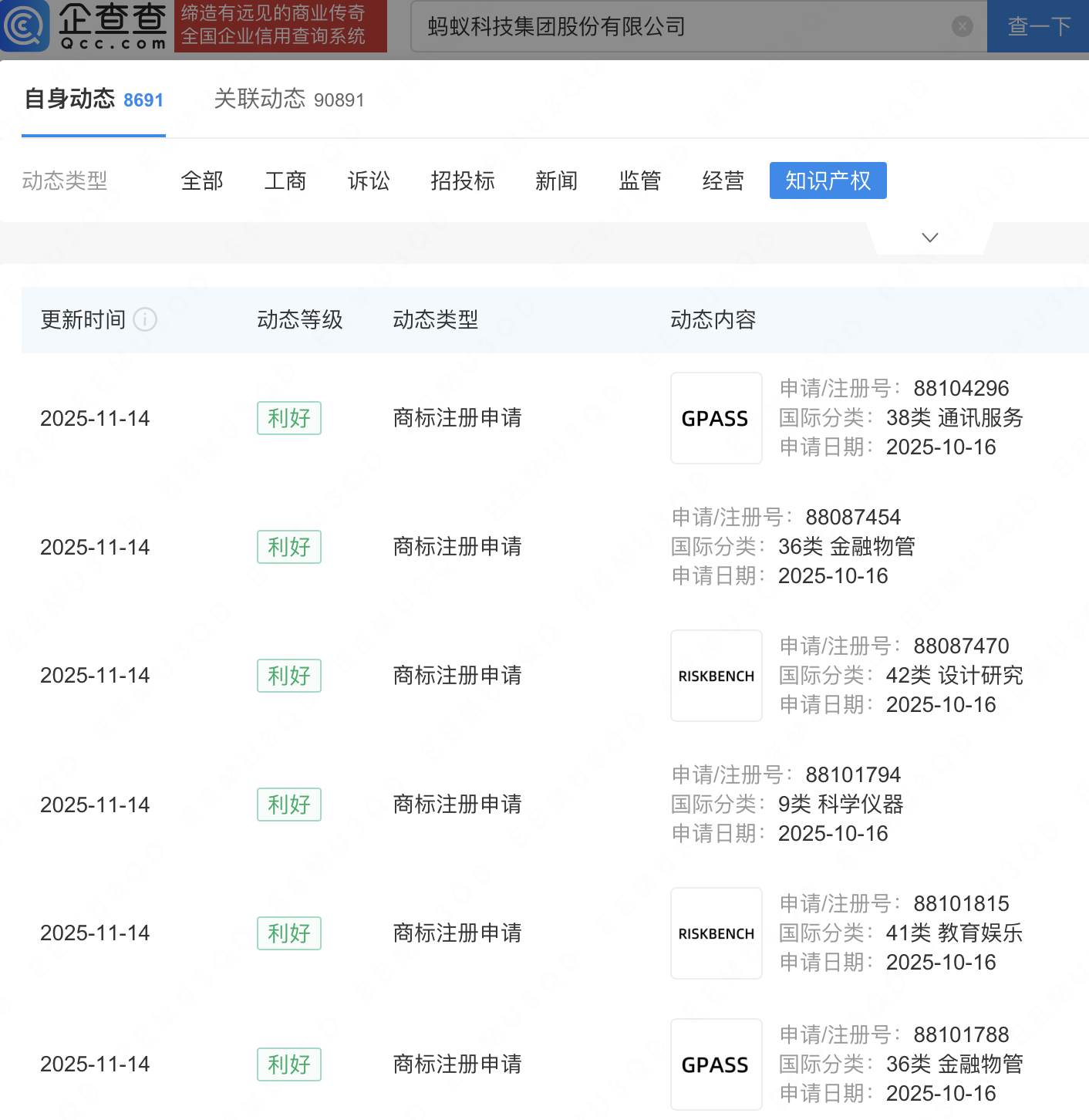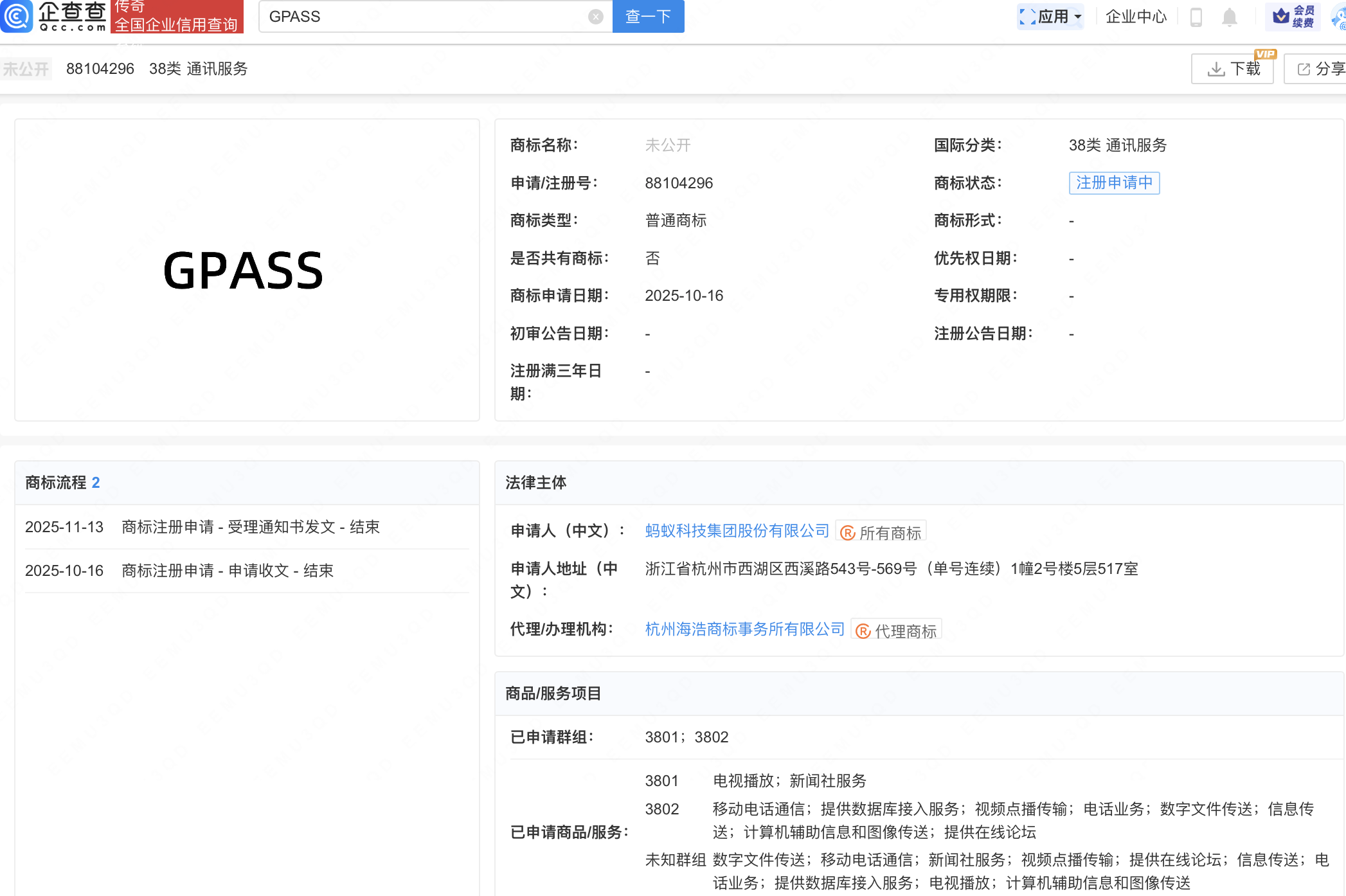 企查查APP显示,近日,蚂蚁科技集团股份有限公司申请注册多枚“GPASS”商标,国际分类涉及通讯服务、金融物管等,当前商标状态均为注册申请中。公开信息显示,GPASS是蚂蚁集团研发的智能终端可信连接技术框架,具备安全、交互、连接三大核心能力。