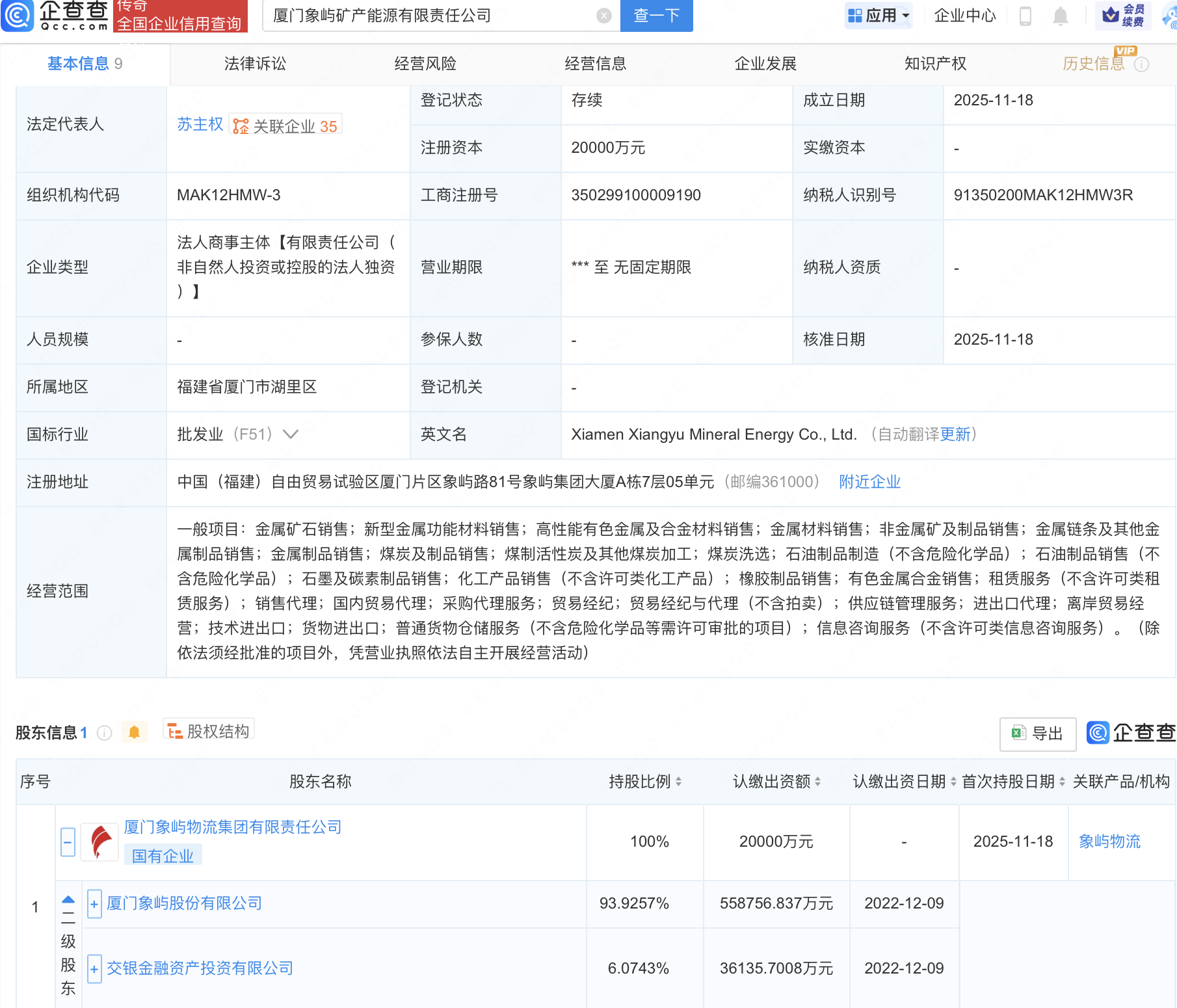 企查查APP显示,近日,厦门象屿矿产能源有限责任公司成立,注册资本2亿元,经营范围包含:金属矿石销售;新型金属功能材料销售;高性能有色金属及合金材料销售;金属材料销售等。企查查股权穿透显示,该公司由厦门象屿(600057)旗下厦门象屿物流集团有限责任公司全资持股。
