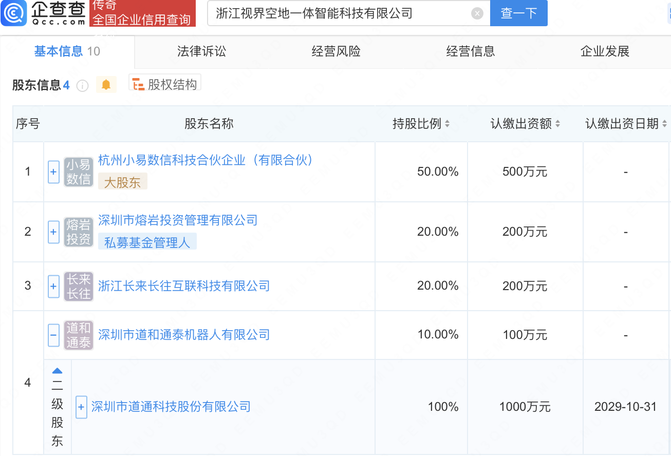 企查查APP显示,近日,浙江视界空地一体智能科技有限公司成立,注册资本1000万元,经营范围包含:人工智能通用应用系统;人工智能行业应用系统集成服务;物联网技术研发;智能无人飞行器销售等。企查查股权穿透显示,该公司由道通科技(688208)全资子公司深圳市道和通泰机器人有限公司等共同持股。