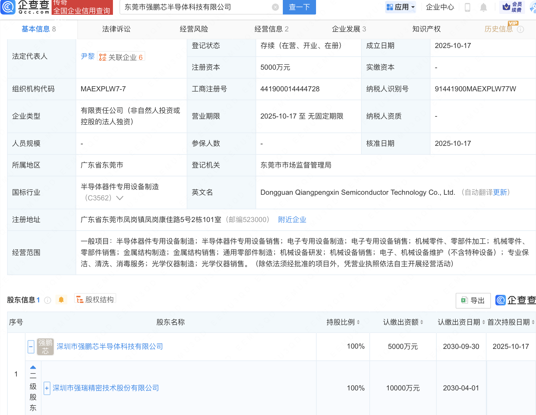 企查查APP显示,近日,东莞市强鹏芯半导体科技有限公司成立,注册资本5000万元,经营范围包含:半导体器件专用设备制造;半导体器件专用设备销售;电子专用设备制造;电子专用设备销售等。企查查股权穿透显示,该公司由强瑞技术(301128)间接全资持股。