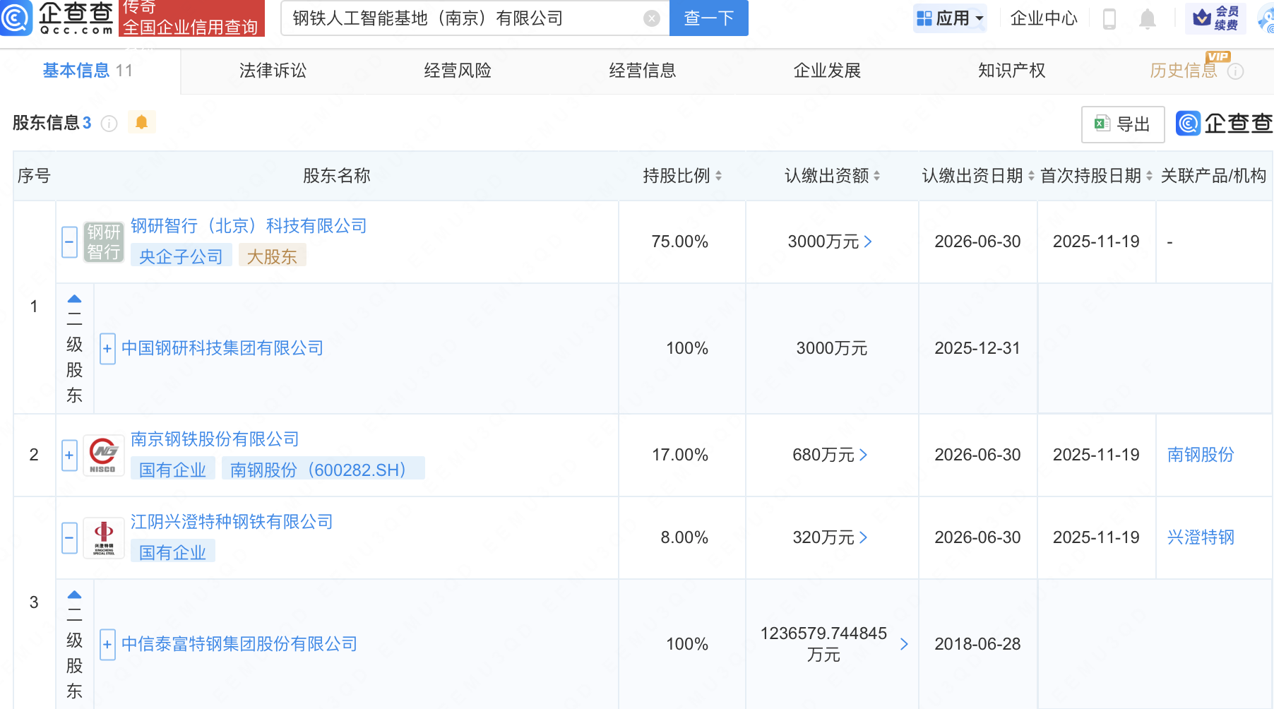 企查查APP显示,近日,钢铁人工智能基地(南京)有限公司成立,注册资本4000万元,经营范围包含:人工智能基础软件开发;人工智能理论与算法软件开发;软件销售;人工智能硬件销售等。企查查股权穿透显示,该公司由中国钢研科技集团有限公司全资子公司钢研智行(北京)科技有限公司、南钢股份(600282)、中信特钢(000708)全资子公司江阴兴澄特种钢铁有限公司共同持股。