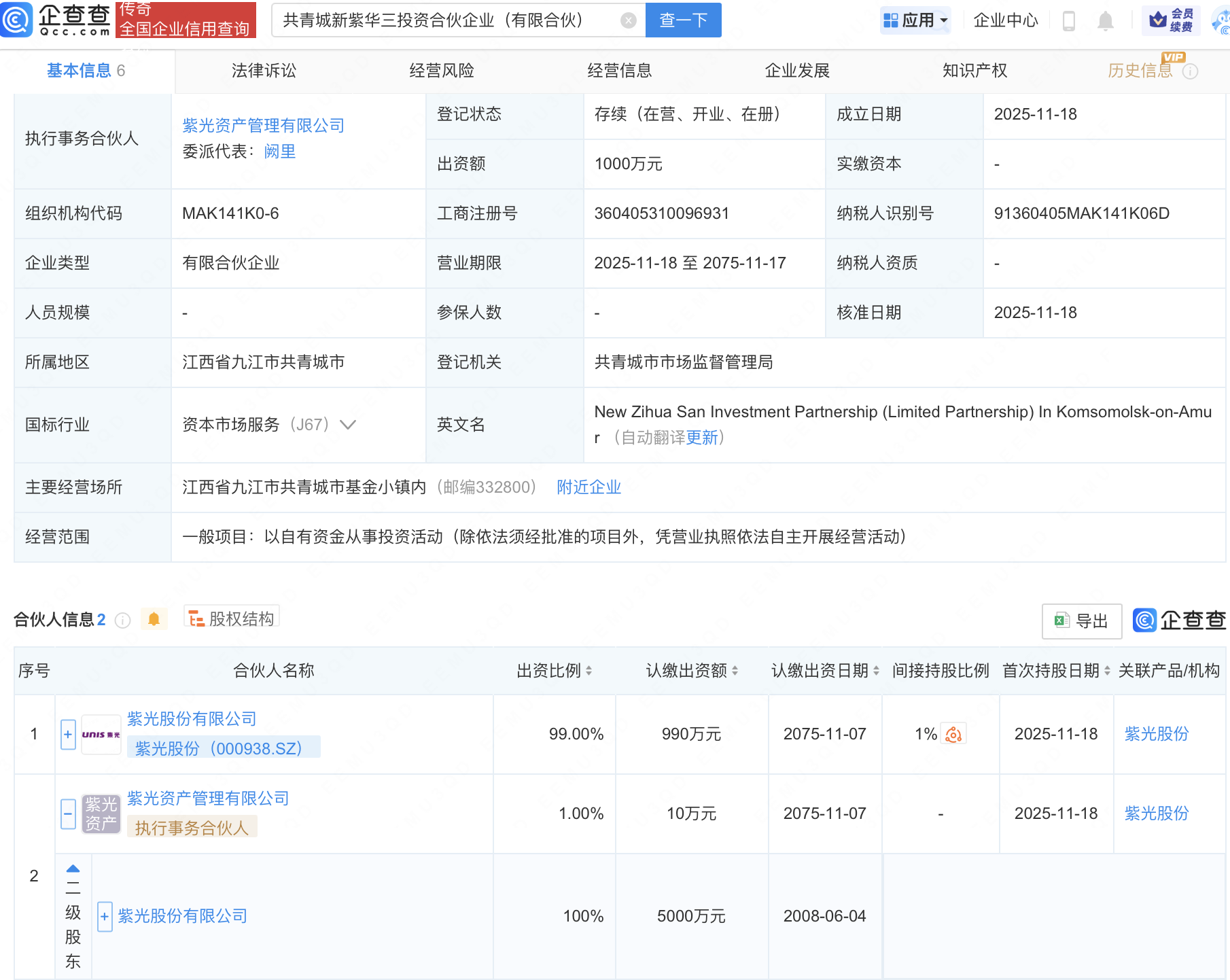 企查查APP显示,近日,共青城新紫华三投资合伙企业(有限合伙)成立,出资额1000万元,经营范围包含:以自有资金从事投资活动。企查查股权穿透显示,该企业由紫光股份(000938)间接全资持股。