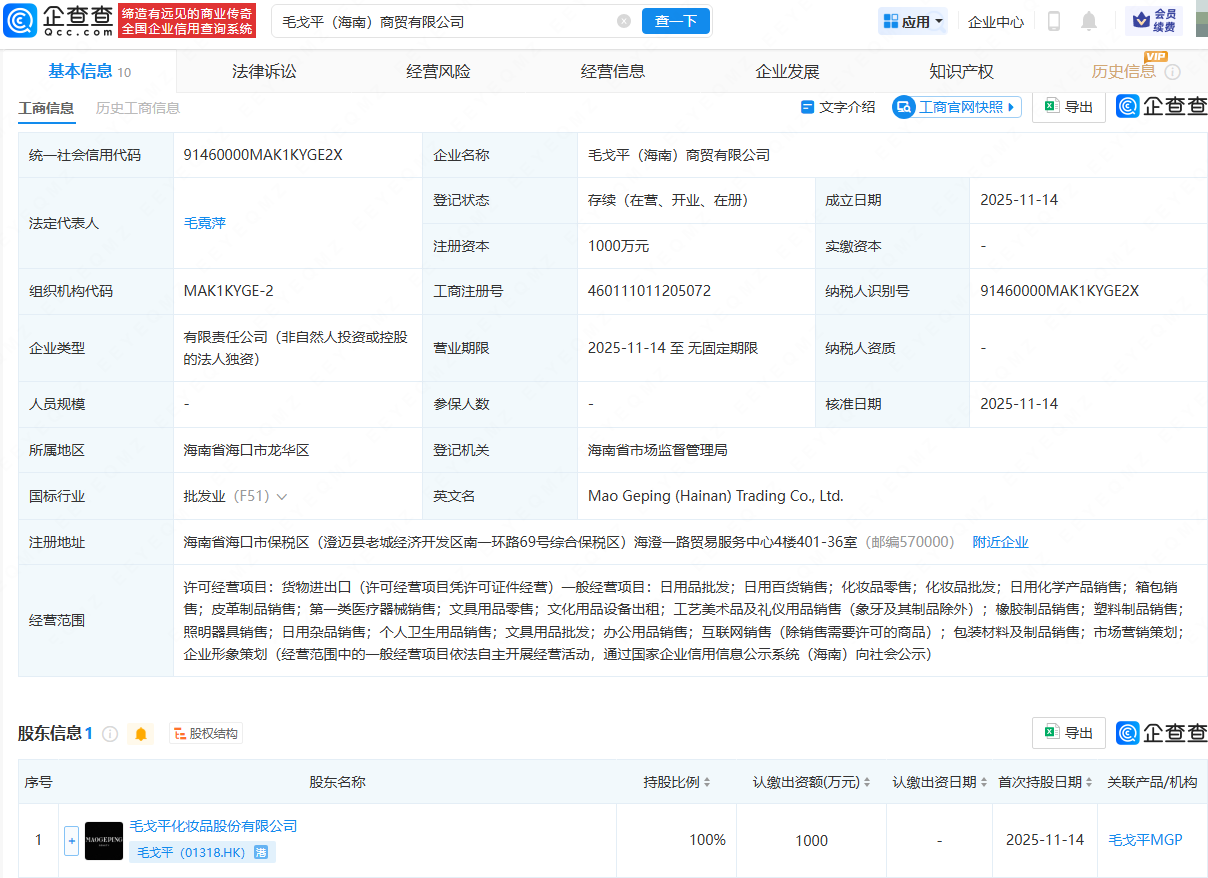 企查查APP显示,近日,毛戈平(海南)商贸有限公司成立,法定代表人为毛霓萍,注册资本为1000万元,经营范围包含:日用品批发;日用百货销售;化妆品零售;化妆品批发;日用化学产品销售;箱包销售等。企查查股权穿透显示,该公司由毛戈平(01318.HK)全资持股。