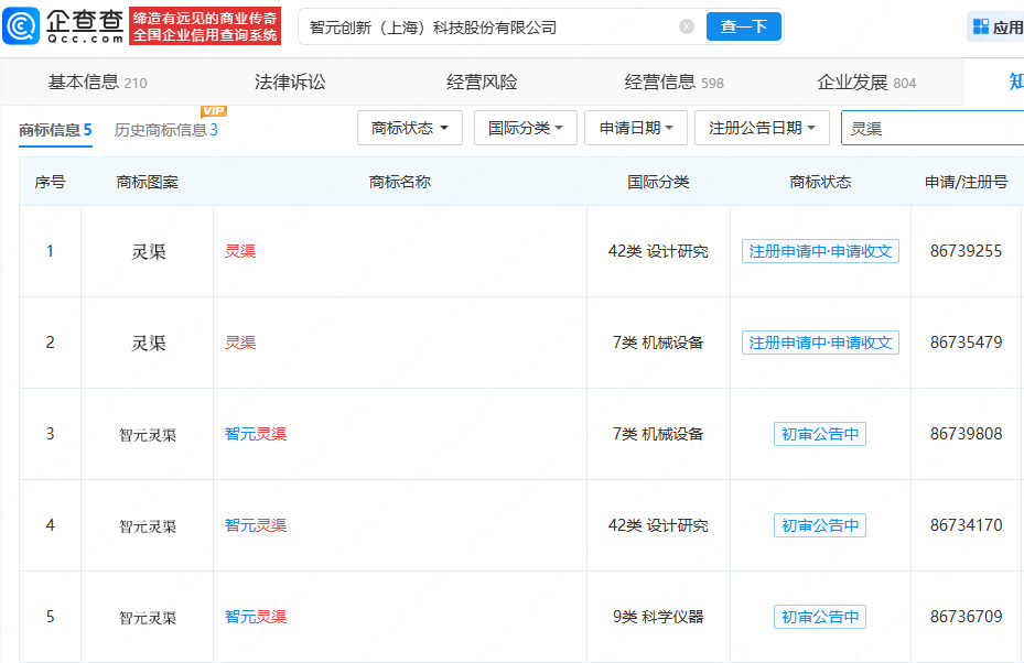 企查查APP显示,智元创新(上海)科技股份有限公司已申请注册多个“灵渠”、“智元灵渠”商标,国际分类包括设计研究、机械设备、科学仪器。