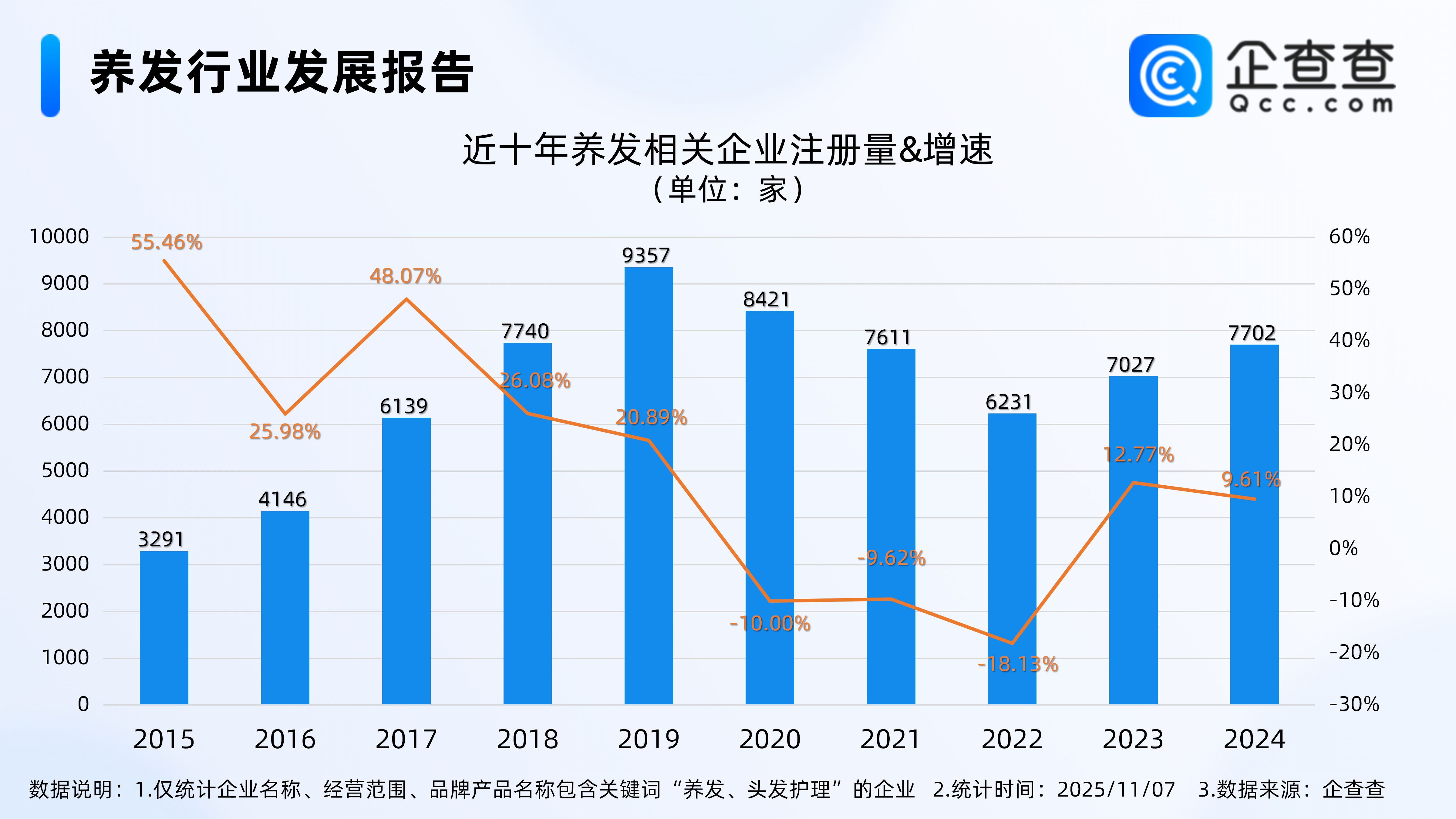 企查查数据显示,截至11月7日,国内现存养发相关企业4.55万家。近十年相关企业注册量呈上下波动态势,其中2019年全年注册9357家养发相关企业,达近十年注册量峰值。2024年全年注册7702家,同比增长9.61%。截至目前,今年已注册6060家相关企业。