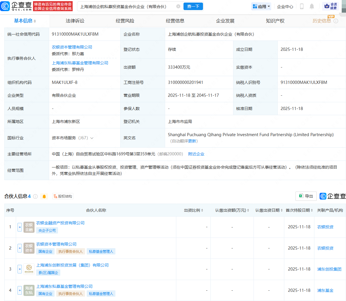 企查查APP显示,近日,上海浦创企航私募投资基金合伙企业(有限合伙)成立,出资额33.34亿元,经营范围包含:以私募基金从事股权投资、投资管理、资产管理等活动。企查查股权穿透显示,该合伙企业由农银金融资产投资有限公司、上海浦东创新投资发展(集团)有限公司等共同持股。