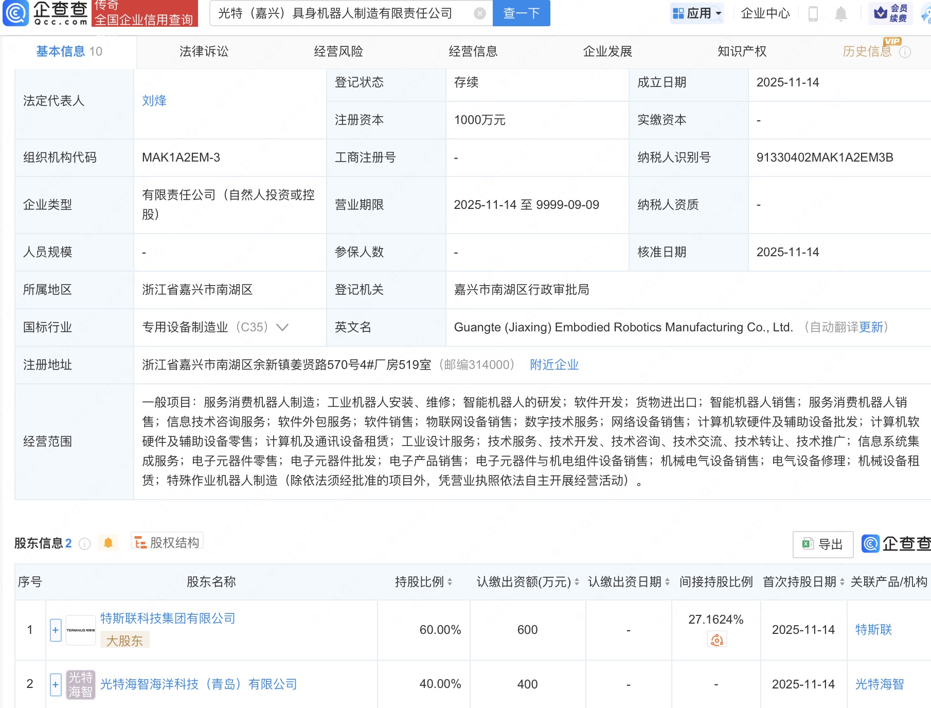企查查APP显示,近日,光特(嘉兴)具身机器人制造有限责任公司成立,法定代表人为刘烽,注册资本1000万人民币,经营范围包括服务消费机器人制造、智能机器人的研发、软件开发等。企查查股权穿透显示,该公司由特斯联科技集团有限公司、光特海智海洋科技(青岛)有限公司共同持股。