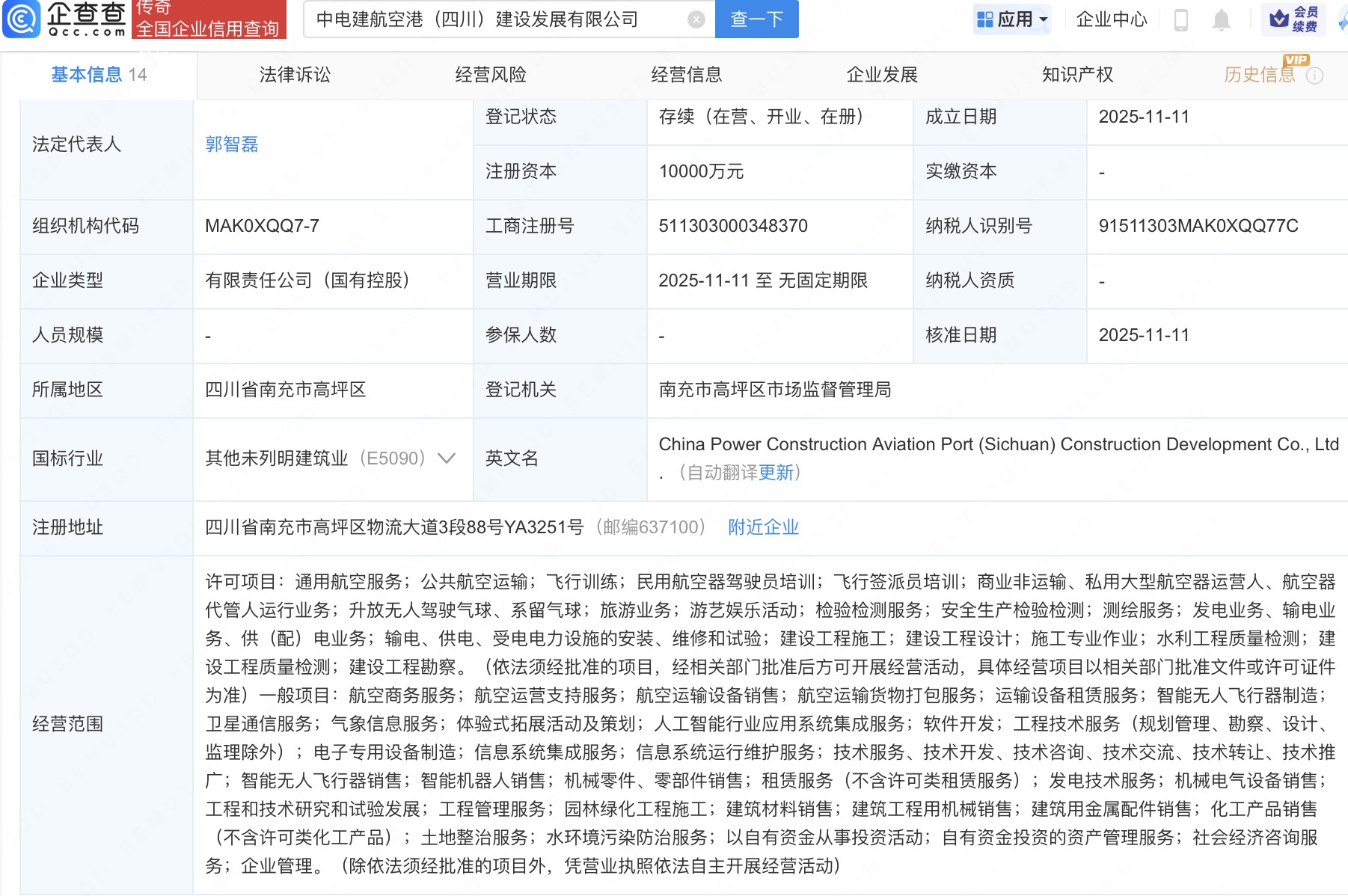 企查查APP显示,近日,中电建航空港(四川)建设发展有限公司成立,法定代表人为郭智磊,注册资本1亿人民币,经营范围包括通用航空服务、公共航空运输、人工智能行业应用系统集成服务、智能无人飞行器制造等。企查查股权穿透显示,该公司由中国电建(601669)旗下中国电建集团成都勘测设计研究院有限公司等共同持股。
