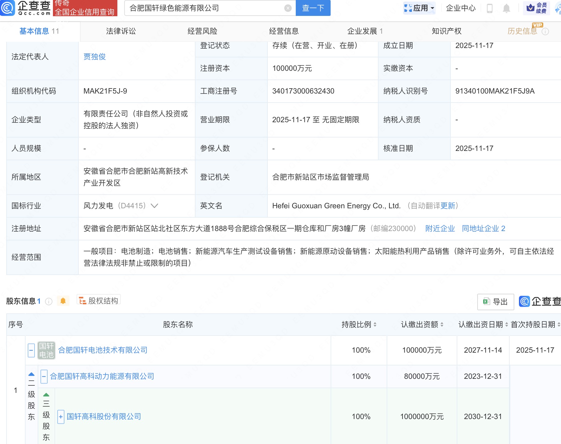 企查查APP显示,近日,合肥国轩绿色能源有限公司成立,法定代表人为贾独俊,注册资本10亿人民币,经营范围包括电池制造、电池销售、新能源汽车生产测试设备销售等。企查查股权穿透显示,该公司由国轩高科(002074)旗下合肥国轩电池技术有限公司全资持股。