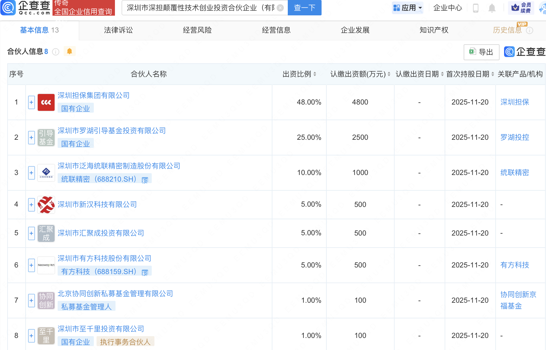 企查查APP显示,近日,深圳市深担颠覆性技术创业投资合伙企业(有限合伙)成立,出资额1亿元,经营范围包含:以自有资金从事投资活动;信息咨询服务(不含许可类信息咨询服务)等。企查查股权穿透显示,该企业由统联精密(688210)、有方科技(688159)等共同出资。