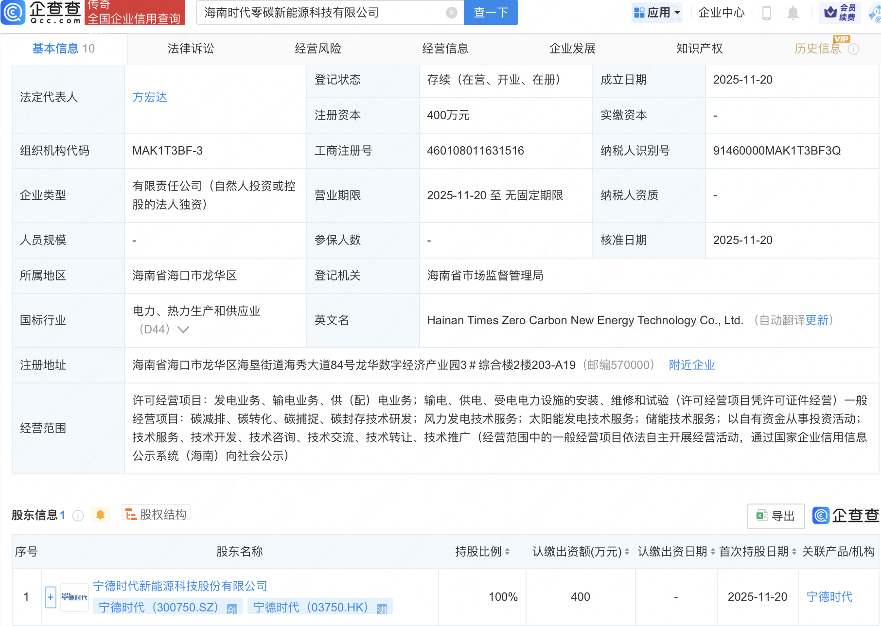 企查查APP显示,近日,海南时代零碳新能源科技有限公司成立,经营范围包含:碳减排、碳转化、碳捕捉、碳封存技术研发;风力发电技术服务;太阳能发电技术服务等。企查查股权穿透显示,该公司由宁德时代(300750)全资持股。