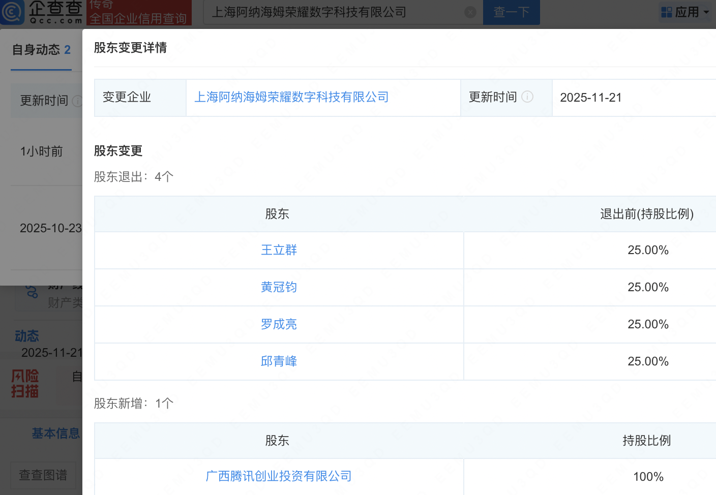 企查查APP显示,近日,上海阿纳海姆荣耀数字科技有限公司发生工商变更,原股东均退出,新增广西腾讯创业投资有限公司为全资股东。企查查信息显示,该公司成立于2025年8月,法定代表人为王立群,经营范围包含:数字创意产品展览展示服务;软件开发;组织文化艺术交流活动;计算机软硬件及辅助设备零售等。