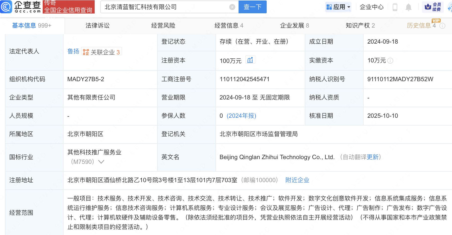 企查查APP显示,近日,北京清蓝智汇科技有限公司发生工商变更,新增蓝色光标(300058)全资子公司上海蓝色光标数据科技集团有限公司等为股东,同时注册资本增至100万元。企查查信息显示,该公司成立于2024年,法定代表人为鲁扬。公开信息显示,清蓝智汇是一家AI营销技术公司。